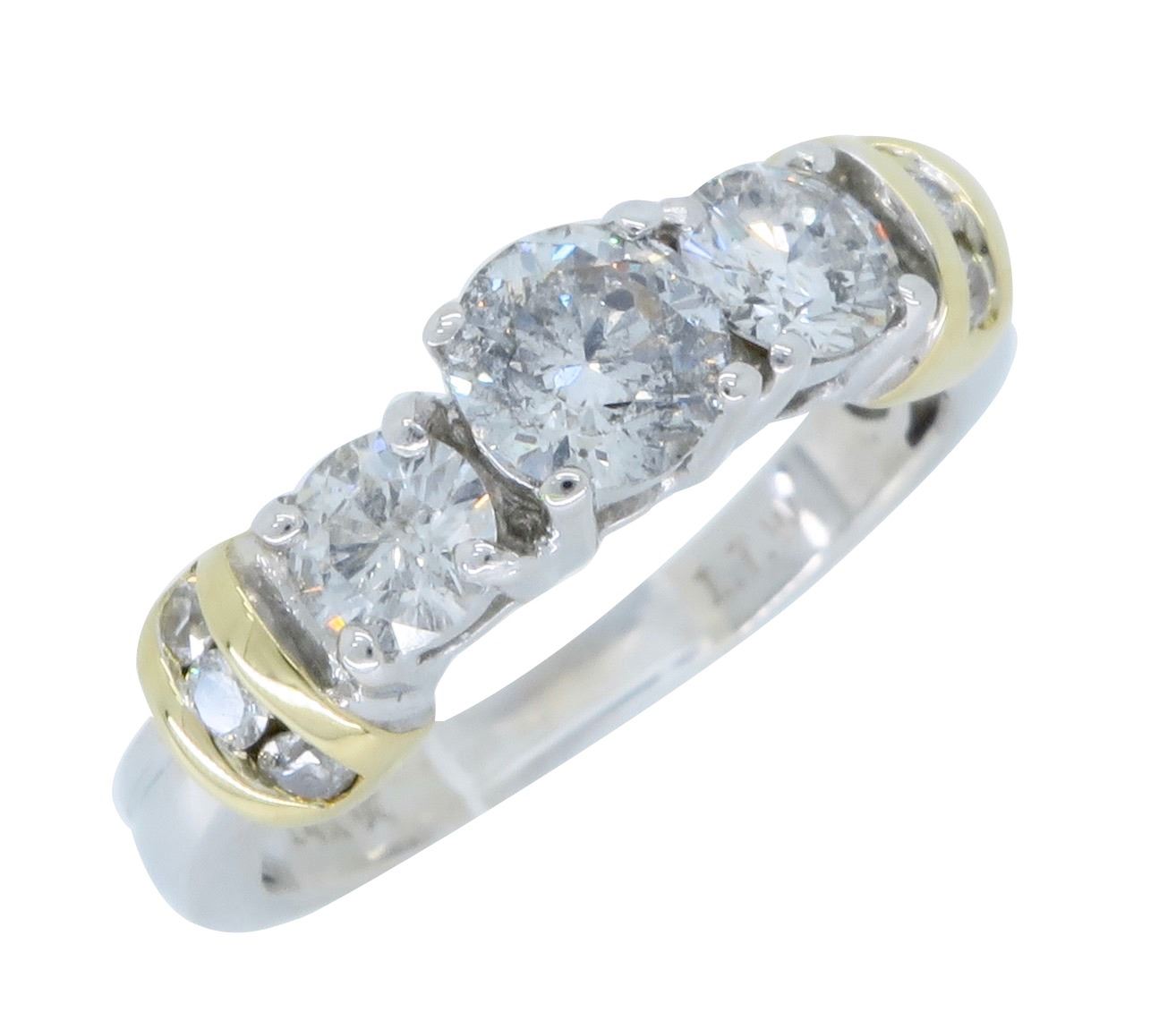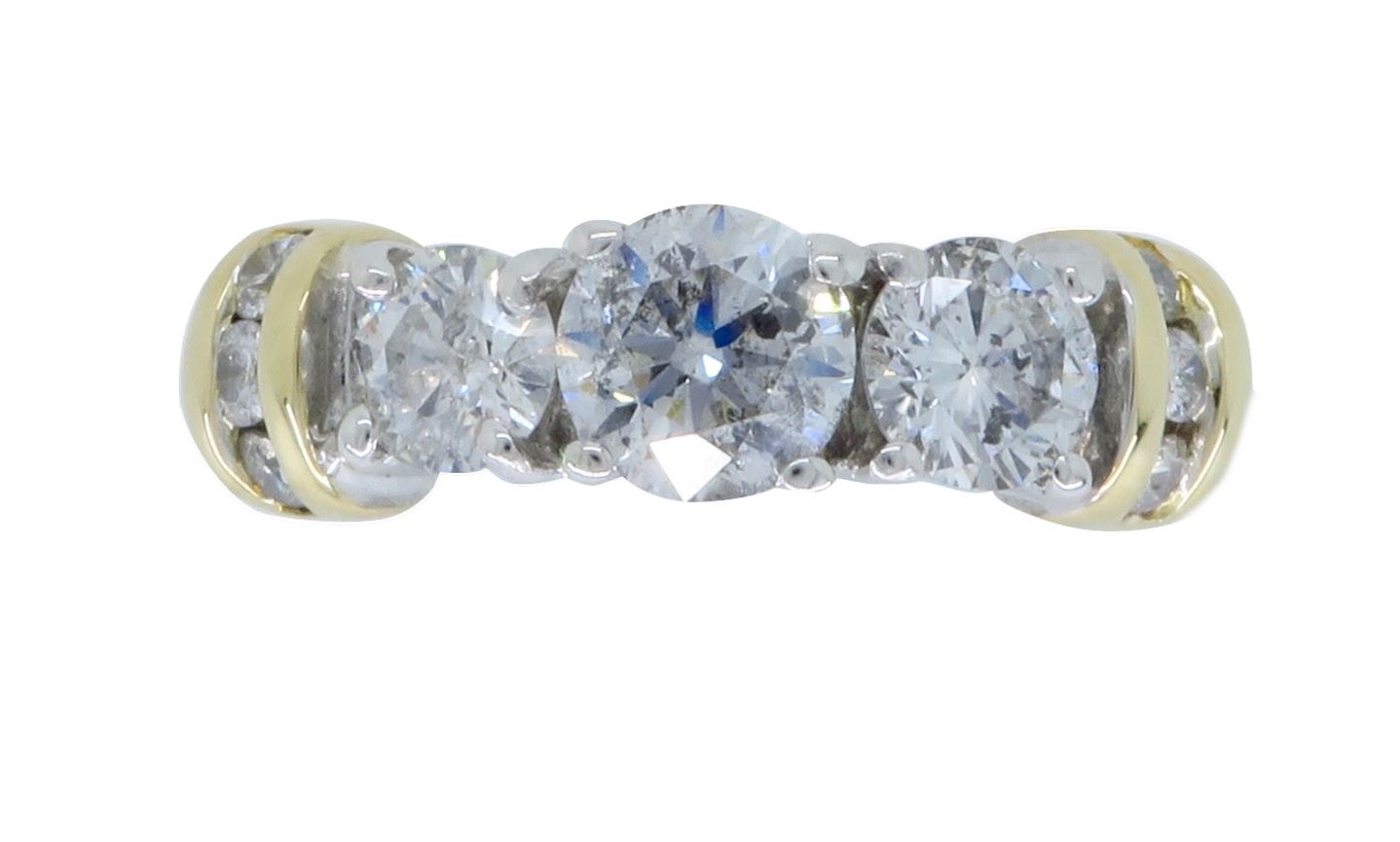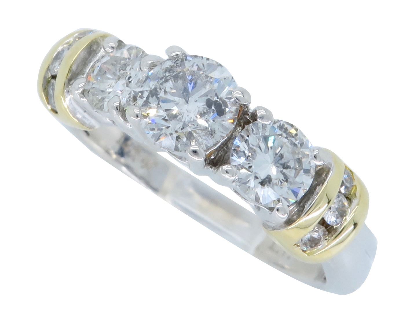 One 14KT Two Tone Gold 1.00ctw Diamond Ring. Round Diamonds with a total weight of 1.00cts with a color of G-I and clarity of I-1 to I-2. Total weight of this ring is 3.6 grams. Ring size is 5.25.
