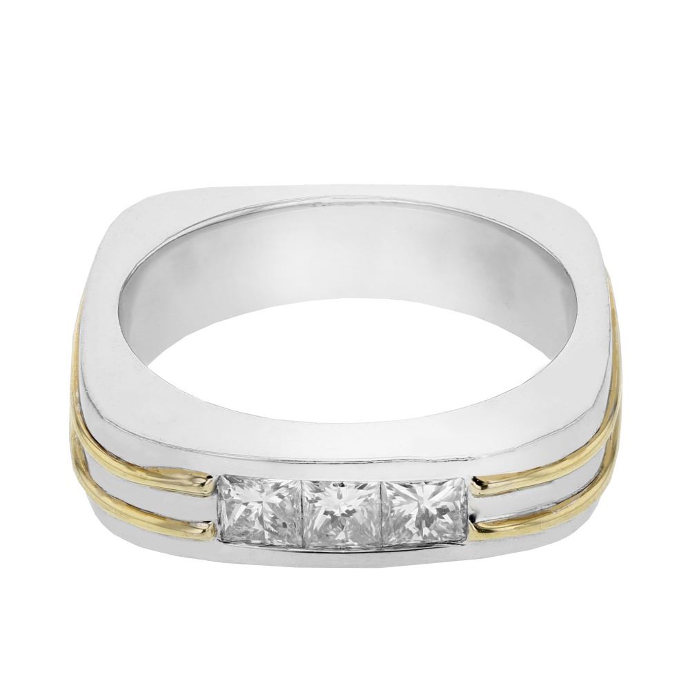One 14KT Two Tone Gold 1.01ctw Diamond Mens Wedding Band. (3) Princess cut Diamonds with a total weight of 1.01cts with a color of I and clarity of I-1. Total weight of this ring is 14.69 grams.
