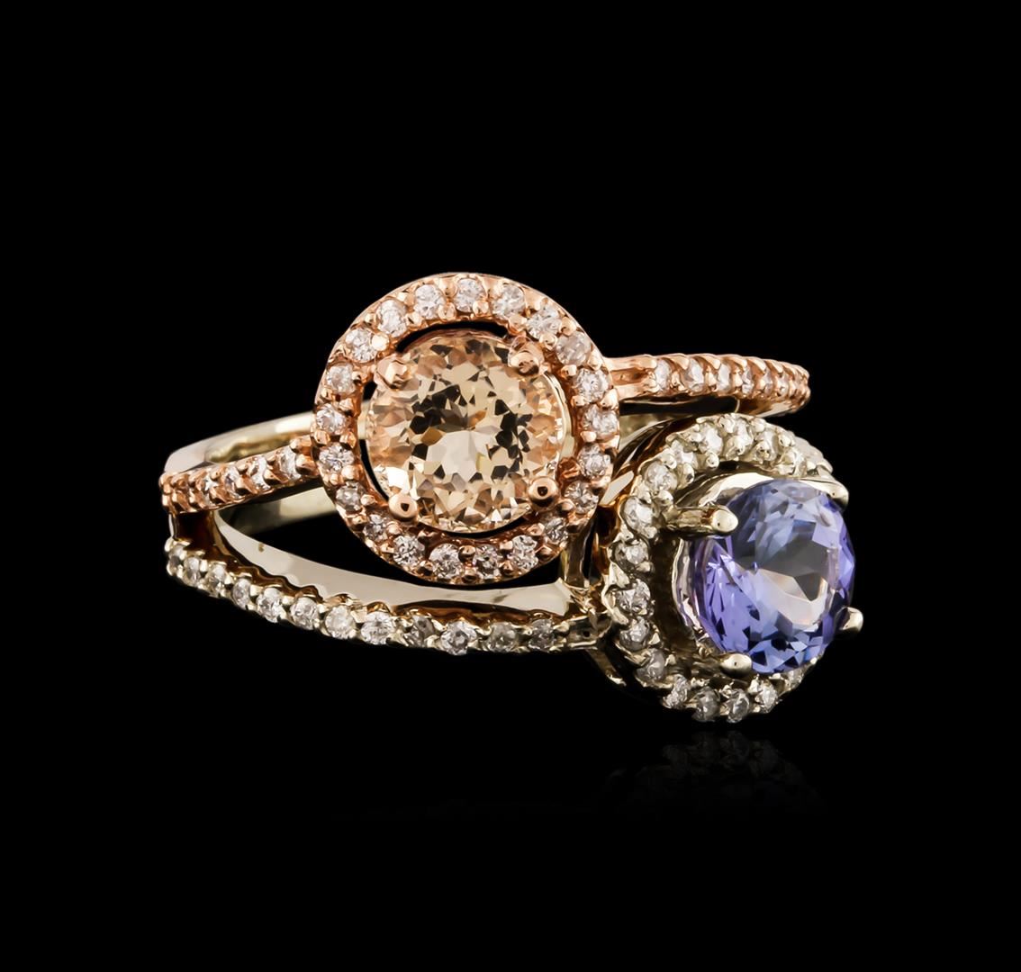 One electronically tested 14KT white and rose gold ladies cast tanzanite, morganite and diamond ring with a bright polish finish. Identified with markings of "14K". Condition is new. Containing: One prong set round modified brilliant cut natural tanzanite, measuring 6.20 - 6.20 x 4.03 mm, approximate weight of 1.04ct., clarity is eye clean, type I, light, very slightly grayish, violet color, (GIA V 3/3), cut is good. One prong set round modified brilliant cut natural morganite, measuring 6.30 - 6.30 x 4.10 mm, approximate weight of 0.89ct., clarity is eye clean, type I, light, brownish, reddish orange color, (GIA rO 3/1), cut is good. Seventy-Eight prong set round brilliant cut diamonds, measuring 1.20 - 1.20 x 0.72mm (depth est.) approximate total weight of 78 Stones = 0.49ct. Clarity: SI-2 to I-1. Color: I - J, Cut is Good. Colored gemstones are presumed to have been subjected to commonly used enhancement processes. All diamonds and colored gemstones are graded in the mounting, unless otherwise stated. Total Weight of Colored Stones 1.93ct. Total Weight of Diamonds 0.49ct. Total Weight of Ring 6.20 grams. GGL Appraised at $3,755.00.