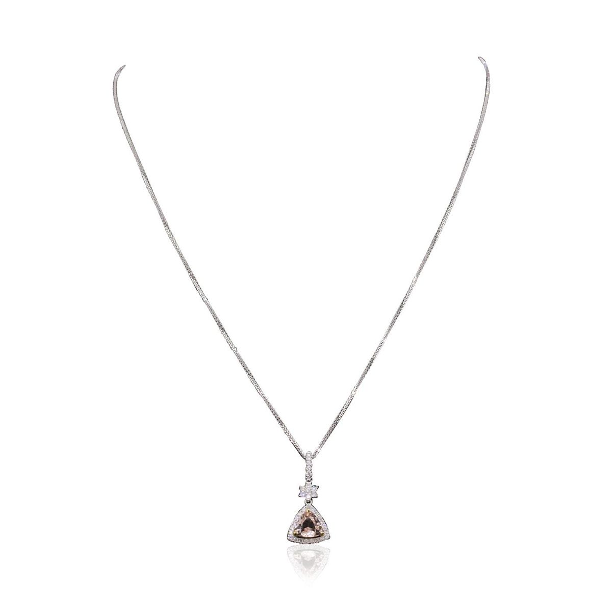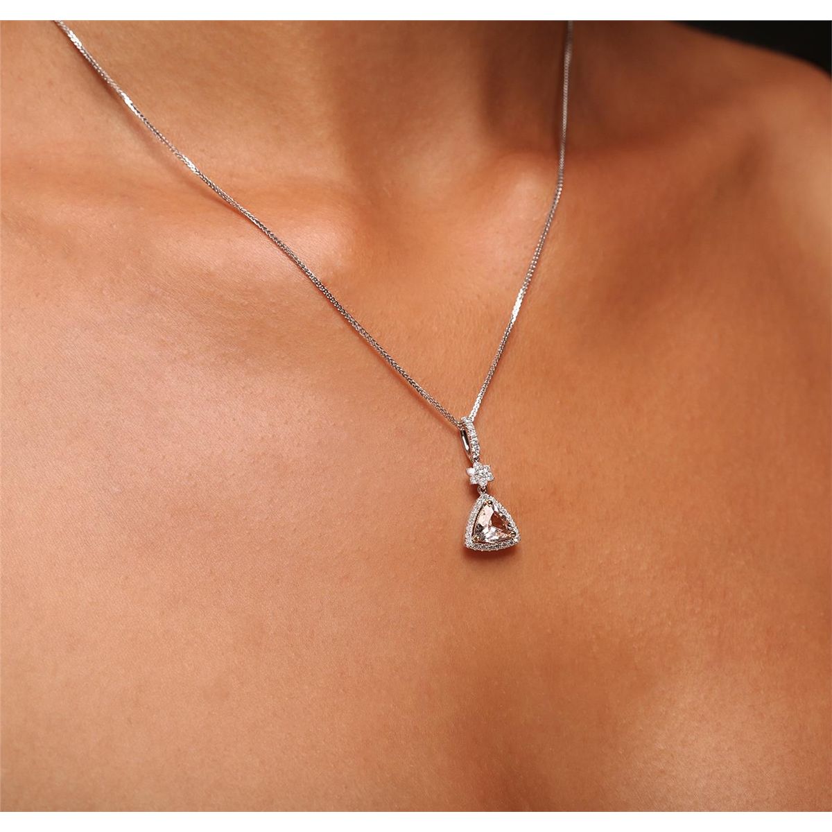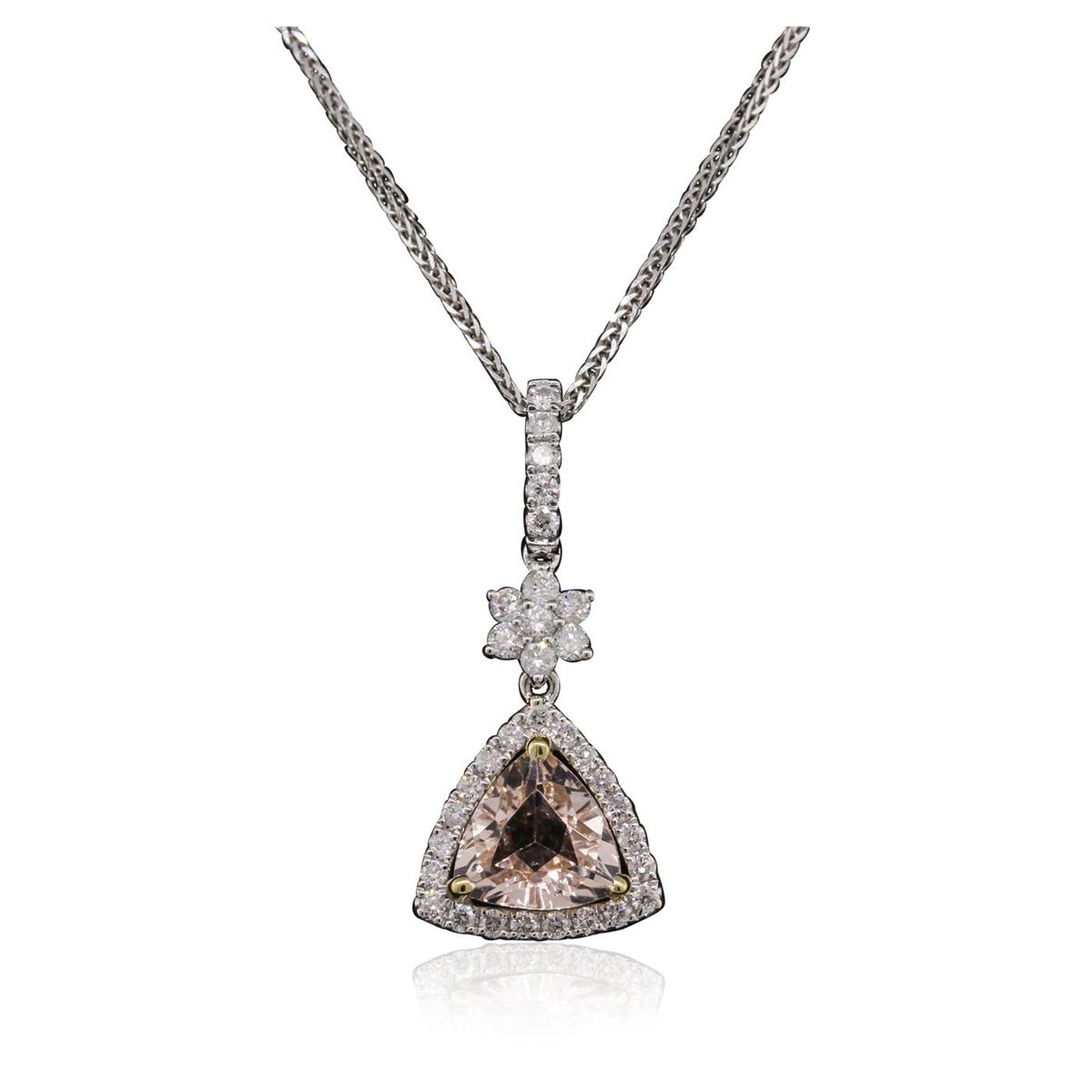 One electronically tested 14KT white and yellow gold Ladies combination cast & assembled pendant with a bright polish finish. Condition is new. Identified with markings of "14K". Containing: Twenty-Six prong set round brilliant cut diamonds, measuring 1.25 - 1.25 x 0.75mm (depth est.) approximate. Total Weight of 26 Stones = 0.25ct. Clarity: SI-2 to I-1. Color: G - H, Cut is Good. Seven prong set round brilliant cut diamonds, measuring 1.60 - 1.60 x 0.96mm (depth est.) approximate. Total Weight of 7 Stones = 0.20ct. Clarity: SI-2 to I-1. Color: G - H, Cut is Good. One prong set triangle modified brilliant cut natural morganite, measuring 8.20 x 8.20 x 3.80mm, exact weight 1.06ct., clarity is eye clean, type I, light, brownish, red orange color, (GIA RO 3/1), cut is good. Colored gemstones are presumed to have been subjected to commonly used color/clarity enhancement processes. Total Weight of Colored Stones 1.06ct. Total Weight of Diamonds 0.45ct. Total Weight of Pendant 3.30 grams. GGL Appraised at $3,500.00.