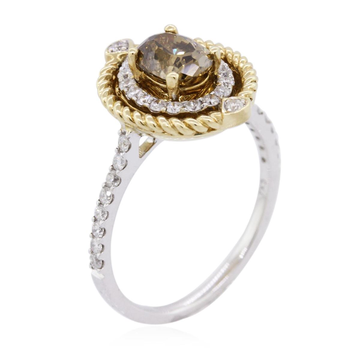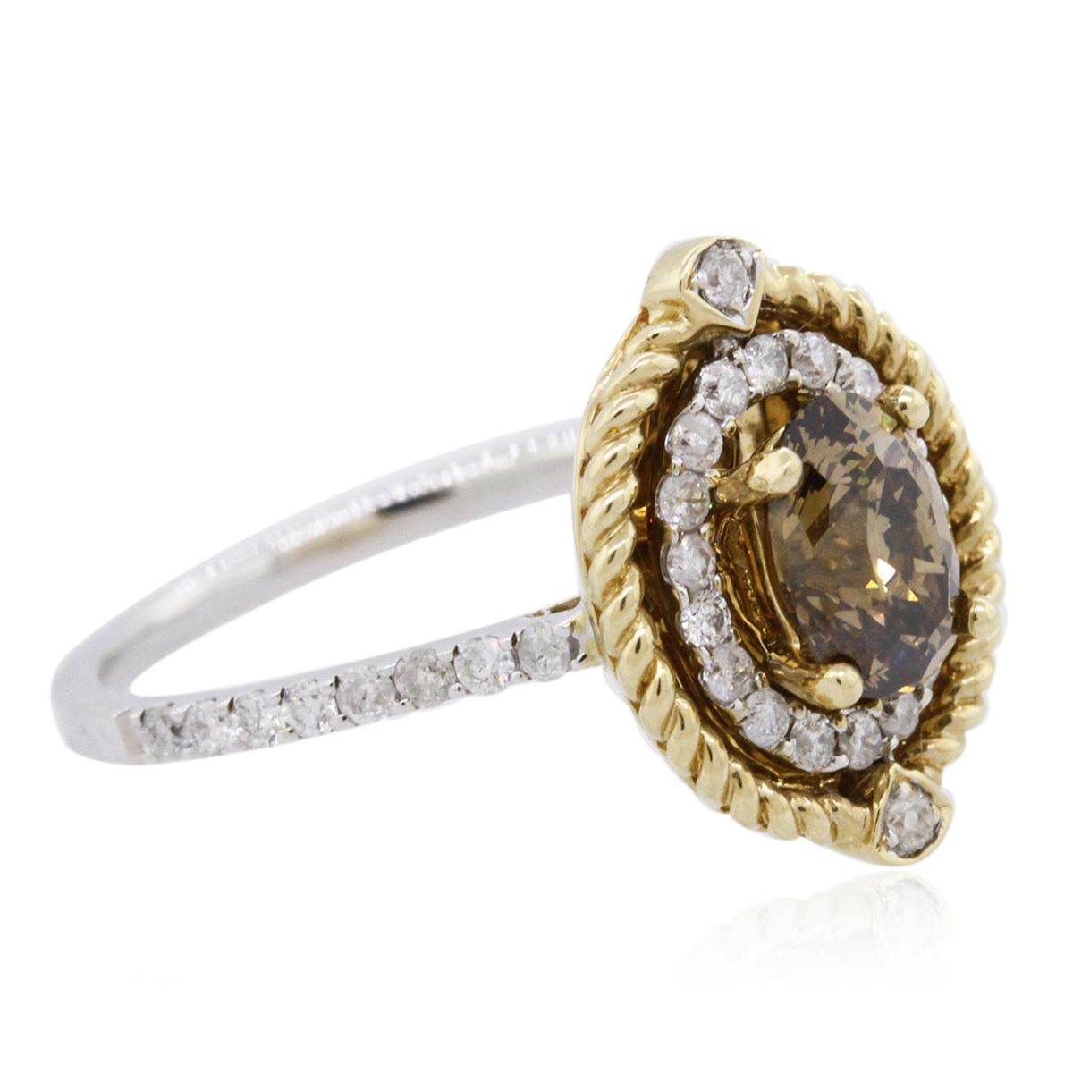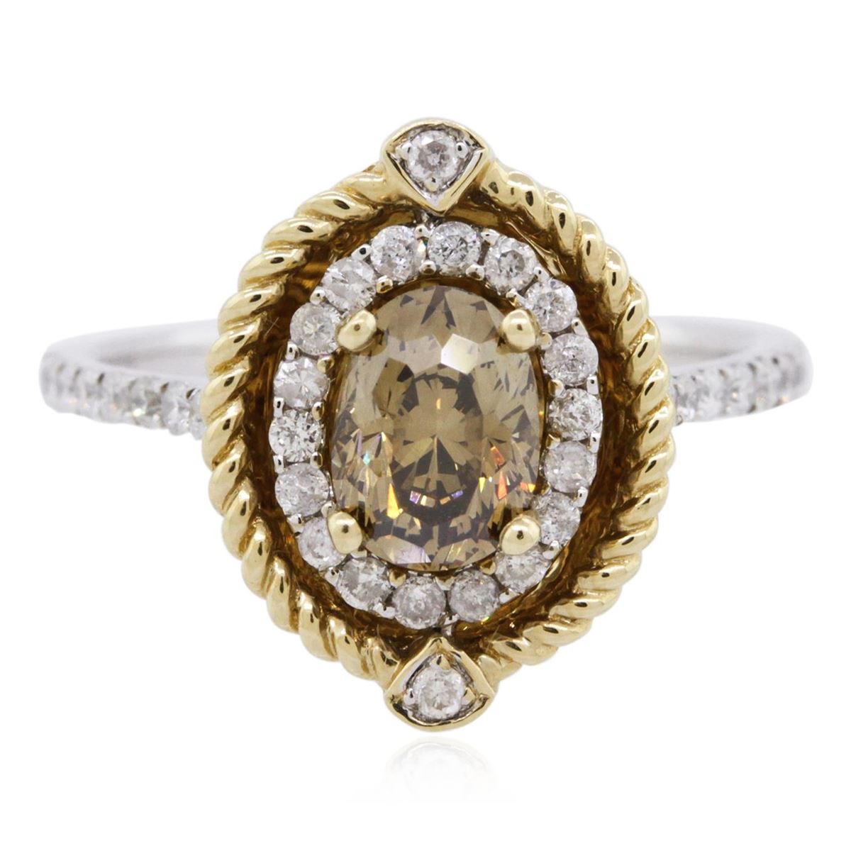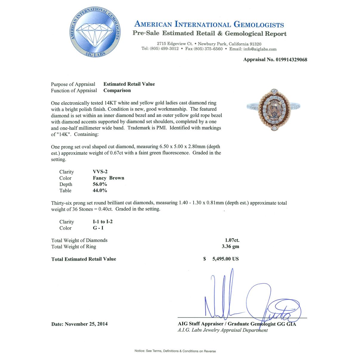 One electronically tested 14KT white and yellow gold ladies cast diamond ring with a bright polish finish. The featured diamond is set within an inner diamond bezel and an outer yellow gold rope bezel with diamond accents supported by diamond set shoulders, completed by a one and one-half millimeter wide band. Trademark is PMI. Identified with markings of "14K". Condition is new, good workmanship. Containing: One prong set oval shaped cut diamond, measuring 6.50 x 5.00 x 2.80mm (depth est.) approximate weight of 0.67ct with a faint green fluorescence. Graded in the setting. Clarity: VVS-2. Depth: 56.0%. Table 44.0%. Thirty-Six prong set round brilliant cut diamonds, measuring 1.40 - 1.30 x 0.81mm (depth est.) approximate total weight of 36 Stones = 0.40ct. Graded in the setting. Clarity: I-1 to I-2. Color: G - I. Total Weight of Diamonds 1.07ct. Total Weight of Ring 3.36 grams. AIG Appraised at $5,495.00.
