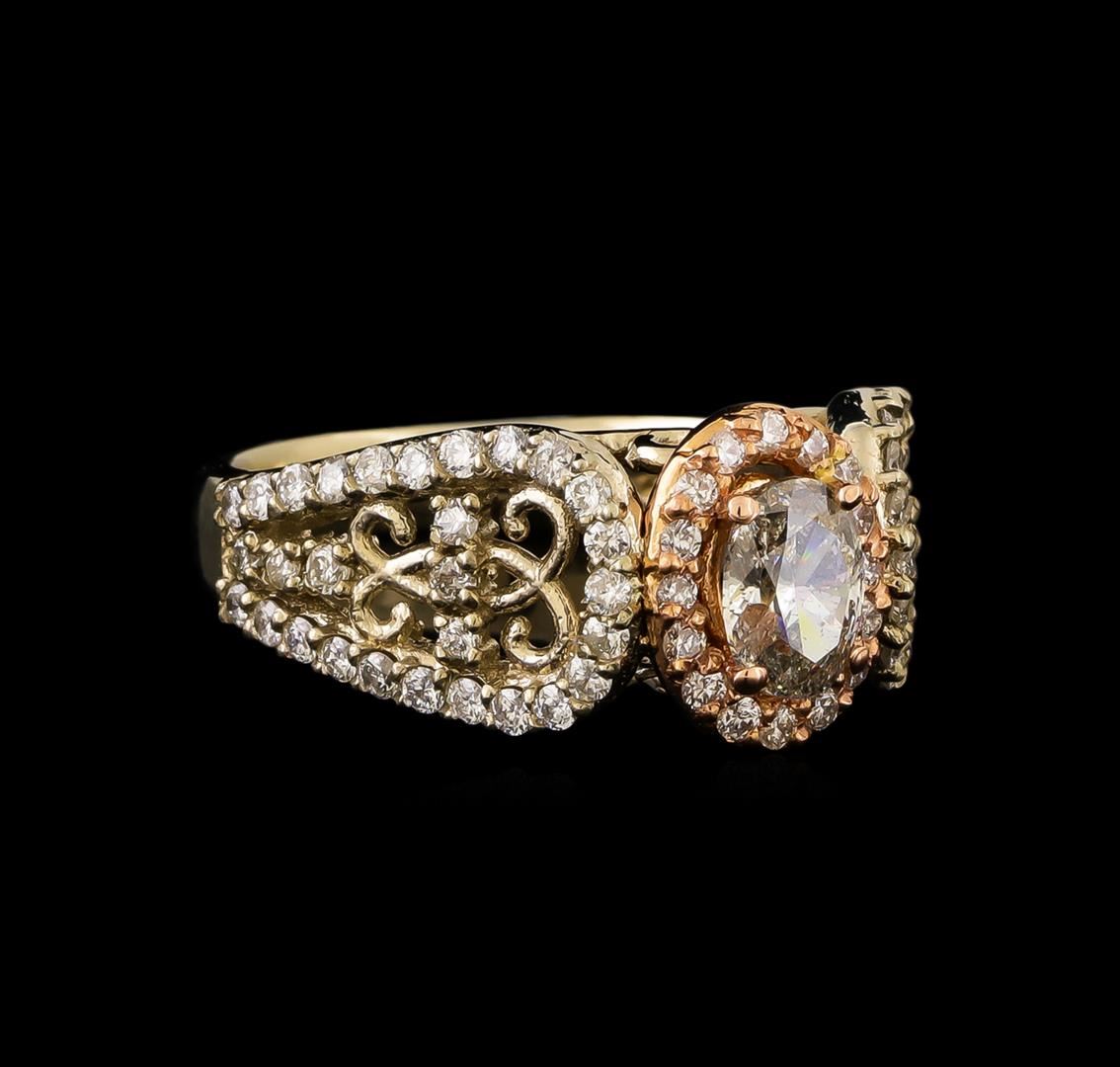 One electronically tested 14KT white and rose gold ladies cast diamond engagement ring with a bright polish finish. Identified with markings of "K14". Condition is new. Containing: One prong set oval shaped cut diamond, measuring 6.36 x 4.85 x 2.76mm (depth est.) approximate weight of 0.54ct. Clarity: I-2. Color: H, Cut is Good. Seventy-Three prong set round brilliant cut diamonds, measuring 1.30 - 1.30 x 0.78mm (depth est.) approximate total weight of 73 Stones = 0.58ct. Clarity: SI-2 to I-1. Color: H - I, Cut is Good. All diamonds are graded in the mounting, unless otherwise stated. Total Weight of Diamonds 1.12ct. Total Weight of Ring 6.20 grams. GGL Appraised at $5,675.00.