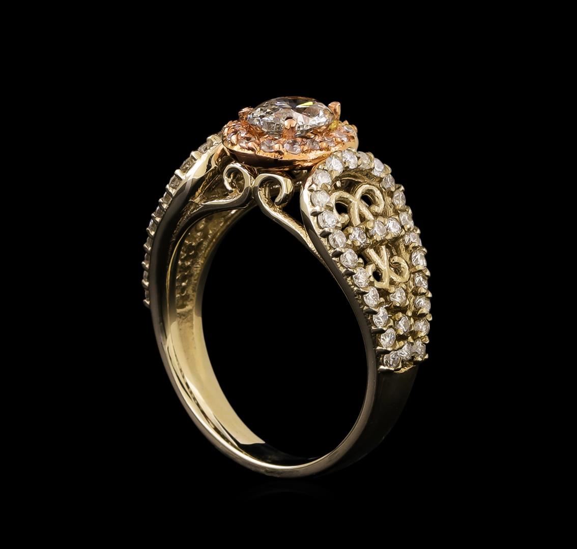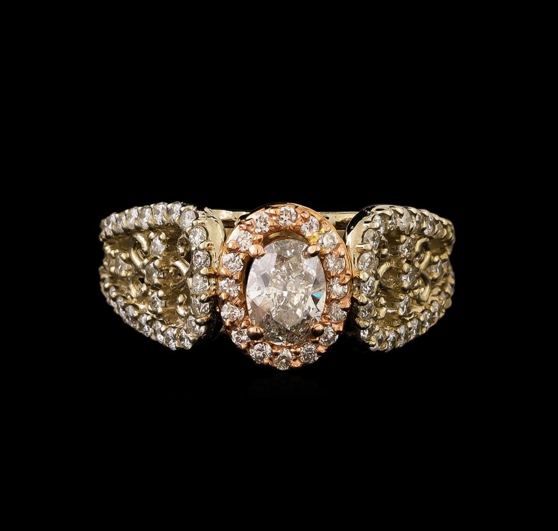 One electronically tested 14KT white and rose gold ladies cast diamond engagement ring with a bright polish finish. Identified with markings of "K14". Condition is new. Containing: One prong set oval shaped cut diamond, measuring 6.36 x 4.85 x 2.76mm (depth est.) approximate weight of 0.54ct. Clarity: I-2. Color: H, Cut is Good. Seventy-Three prong set round brilliant cut diamonds, measuring 1.30 - 1.30 x 0.78mm (depth est.) approximate total weight of 73 Stones = 0.58ct. Clarity: SI-2 to I-1. Color: H - I, Cut is Good. All diamonds are graded in the mounting, unless otherwise stated. Total Weight of Diamonds 1.12ct. Total Weight of Ring 6.20 grams. GGL Appraised at $5,675.00.