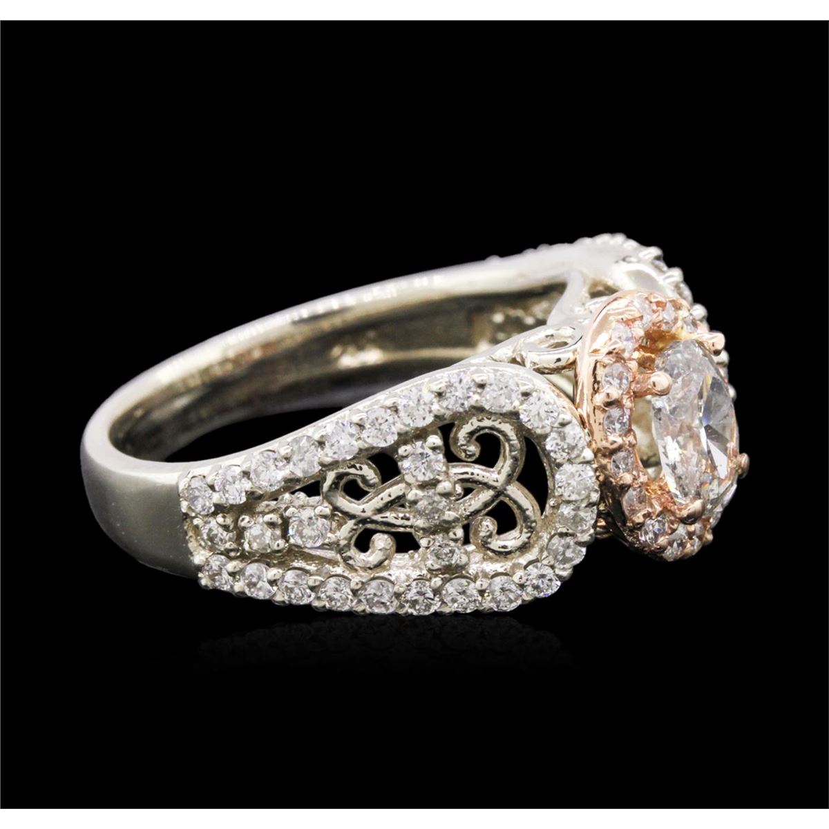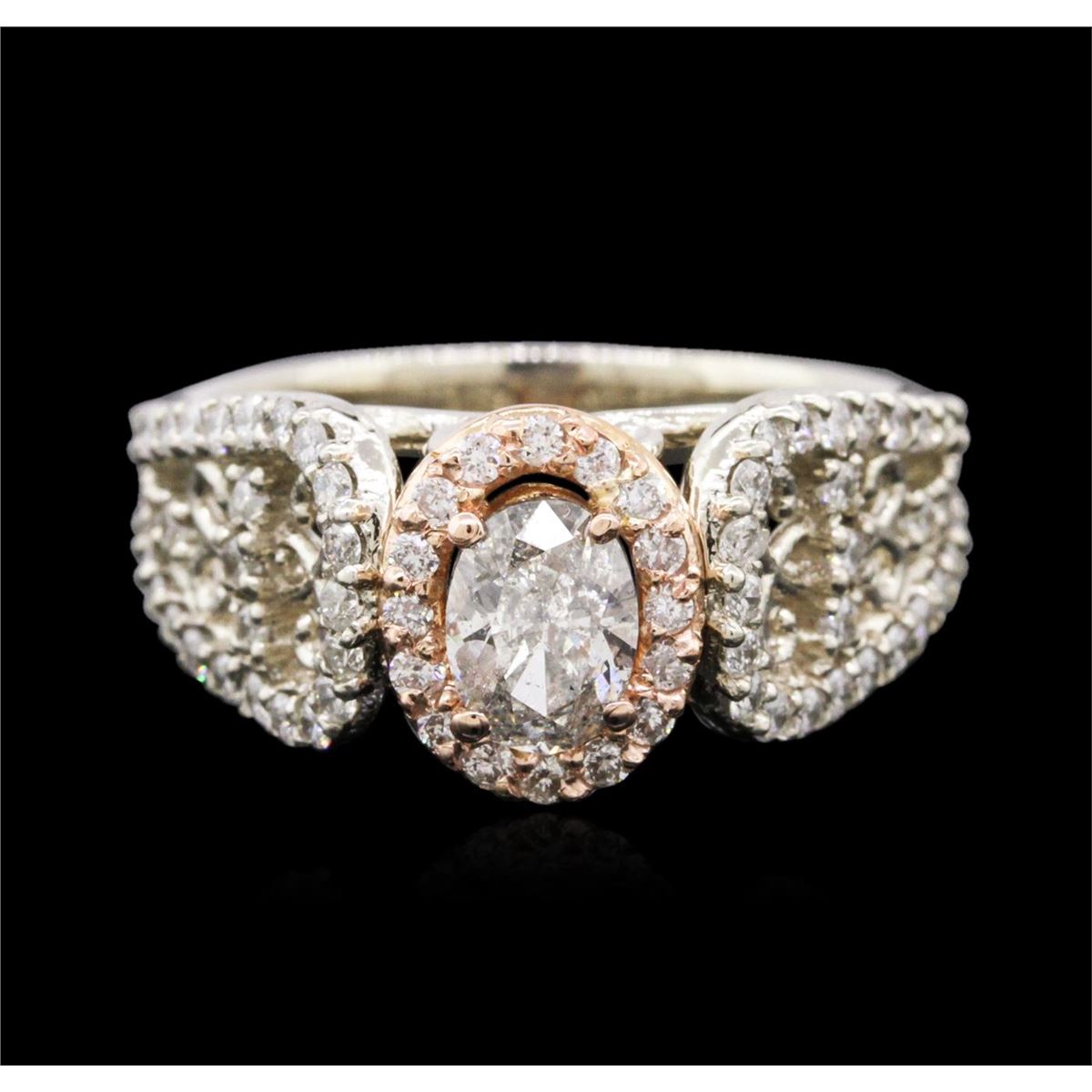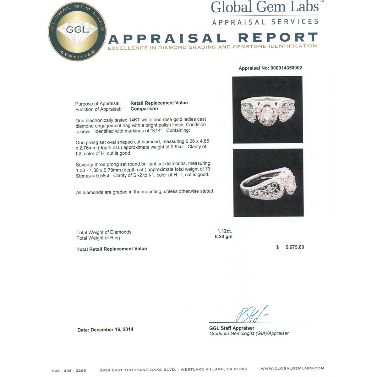 One electronically tested 14KT white and rose gold ladies cast diamond engagement ring with a bright polish finish. Identified with markings of "K14". Condition is new. Containing: One prong set oval shaped cut diamond, measuring 6.36 x 4.85 x 2.76mm (depth est.) approximate weight of 0.54ct. Clarity: I-2. Color: H, Cut is Good. Seventy-Three prong set round brilliant cut diamonds, measuring 1.30 - 1.30 x 0.78mm (depth est.) approximate total weight of 73 Stones = 0.58ct. Clarity: SI-2 to I-1. Color: H - I, Cut is Good. All diamonds are graded in the mounting, unless otherwise stated. Total Weight of Diamonds 1.12ct. Total Weight of Ring 6.20 grams. GGL Appraised at $5,675.00.