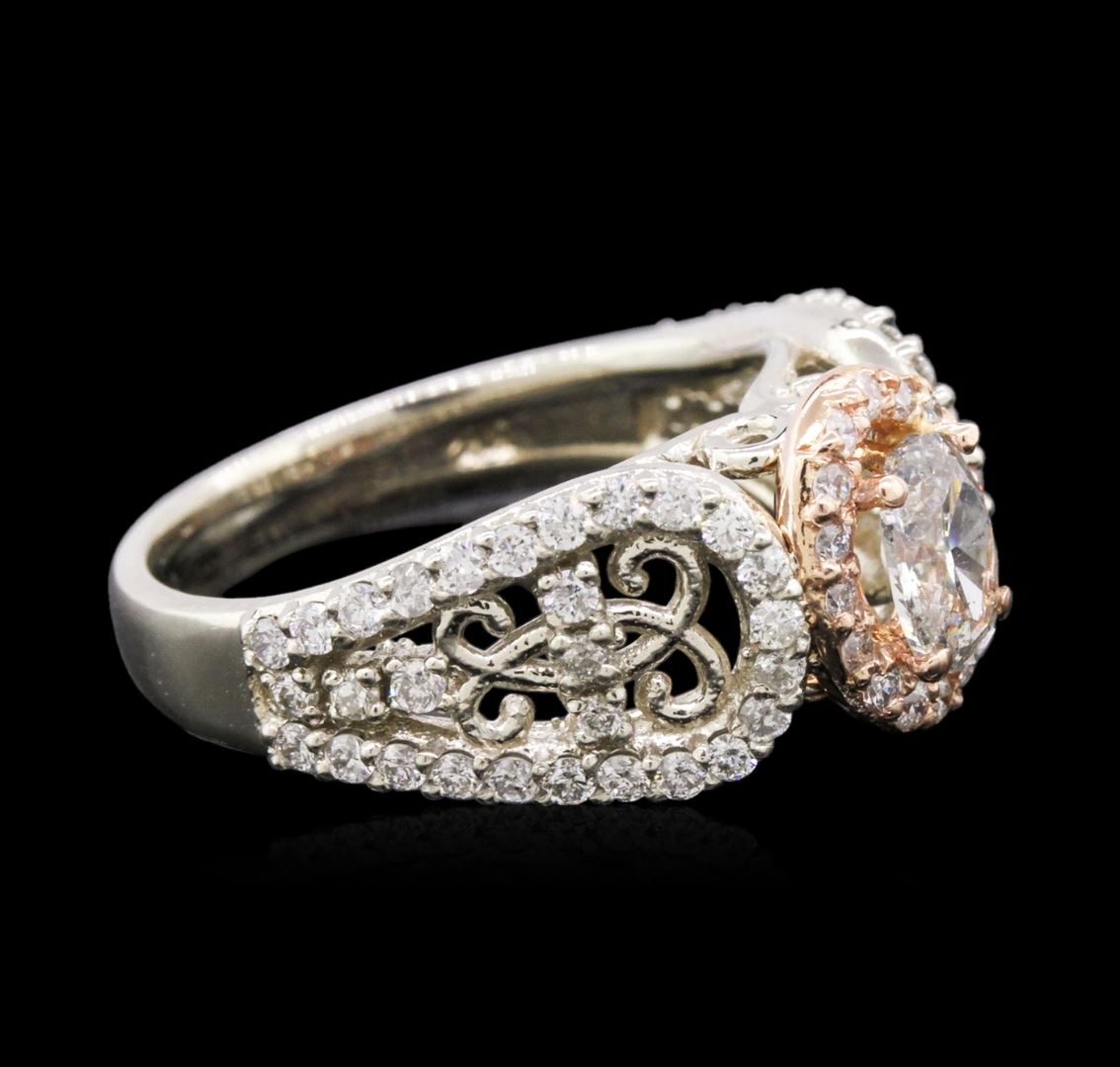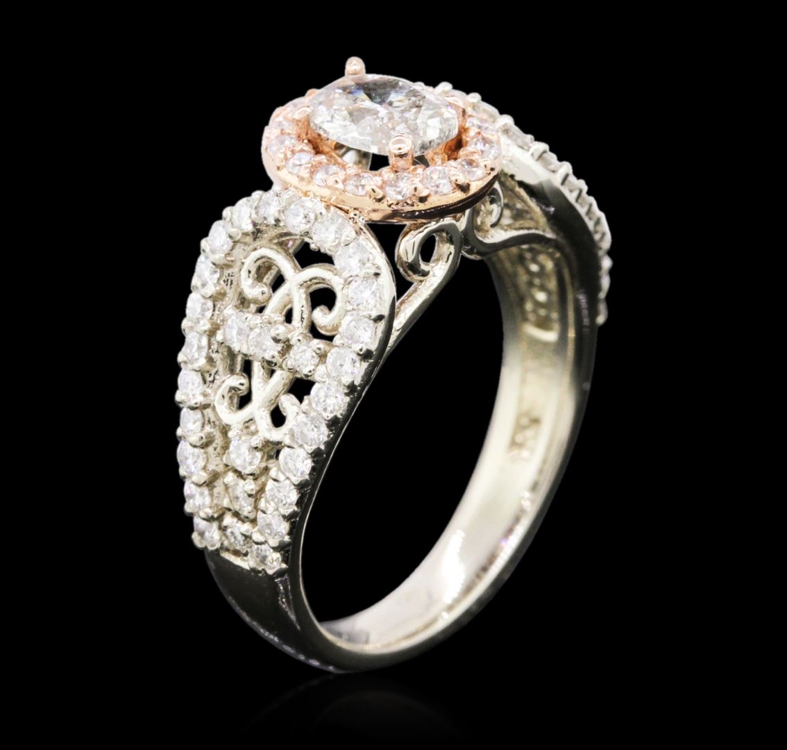 One electronically tested 14KT white and rose gold ladies cast diamond engagement ring with a bright polish finish. Identified with markings of "K14". Condition is new. Containing: One prong set oval shaped cut diamond, measuring 6.36 x 4.85 x 2.76mm (depth est.) approximate weight of 0.54ct. Clarity: I-2. Color: H, Cut is Good. Seventy-Three prong set round brilliant cut diamonds, measuring 1.30 - 1.30 x 0.78mm (depth est.) approximate total weight of 73 Stones = 0.58ct. Clarity: SI-2 to I-1. Color: H - I, Cut is Good. All diamonds are graded in the mounting, unless otherwise stated. Total Weight of Diamonds 1.12ct. Total Weight of Ring 6.20 grams. GGL Appraised at $5,675.00.