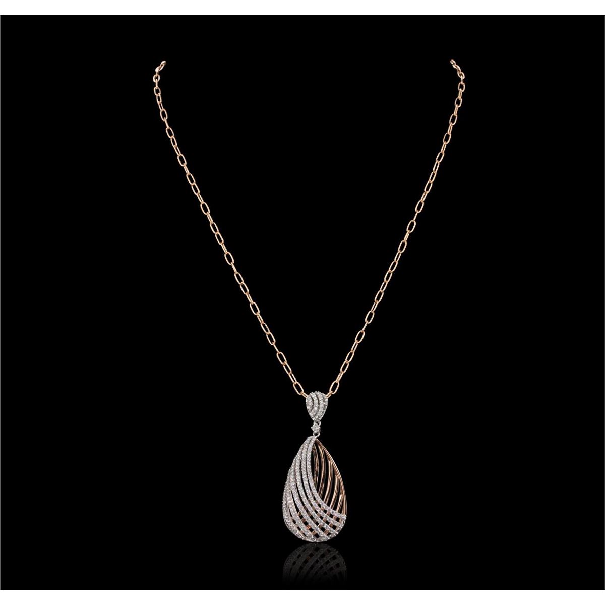 One electronically tested 14KT rose and white gold ladies combination cast & die struck pendant & chain 18.0" long, medium cable link with a lobster claw clasp with a bright polish finish. Condition is new. Identified with markings of "K14-585". Containing: One Hundred Forty-Three prong set round brilliant cut diamonds, measuring 1.30 - 1.30 x 0.78mm (depth est.) approximate. Total Weight of 143 Stones = 1.14ct. Clarity: I-1 to I-2. Color: I - K, Cut is Good. All diamonds are graded in the mounting, unless otherwise stated. Total Weight of Diamonds 1.14ct. Total Weight of Pendant & Chain 10.10 grams. GGL Appraised at $6,500.00.