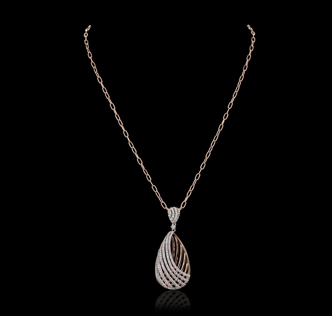 One electronically tested 14KT rose and white gold ladies combination cast & die struck pendant & chain 18.0" long, medium cable link with a lobster claw clasp with a bright polish finish. Condition is new. Identified with markings of "K14-585". Containing: One Hundred Forty-Three prong set round brilliant cut diamonds, measuring 1.30 - 1.30 x 0.78mm (depth est.) approximate. Total Weight of 143 Stones = 1.14ct. Clarity: I-1 to I-2. Color: I - K, Cut is Good. All diamonds are graded in the mounting, unless otherwise stated. Total Weight of Diamonds 1.14ct. Total Weight of Pendant & Chain 10.10 grams. GGL Appraised at $6,500.00.