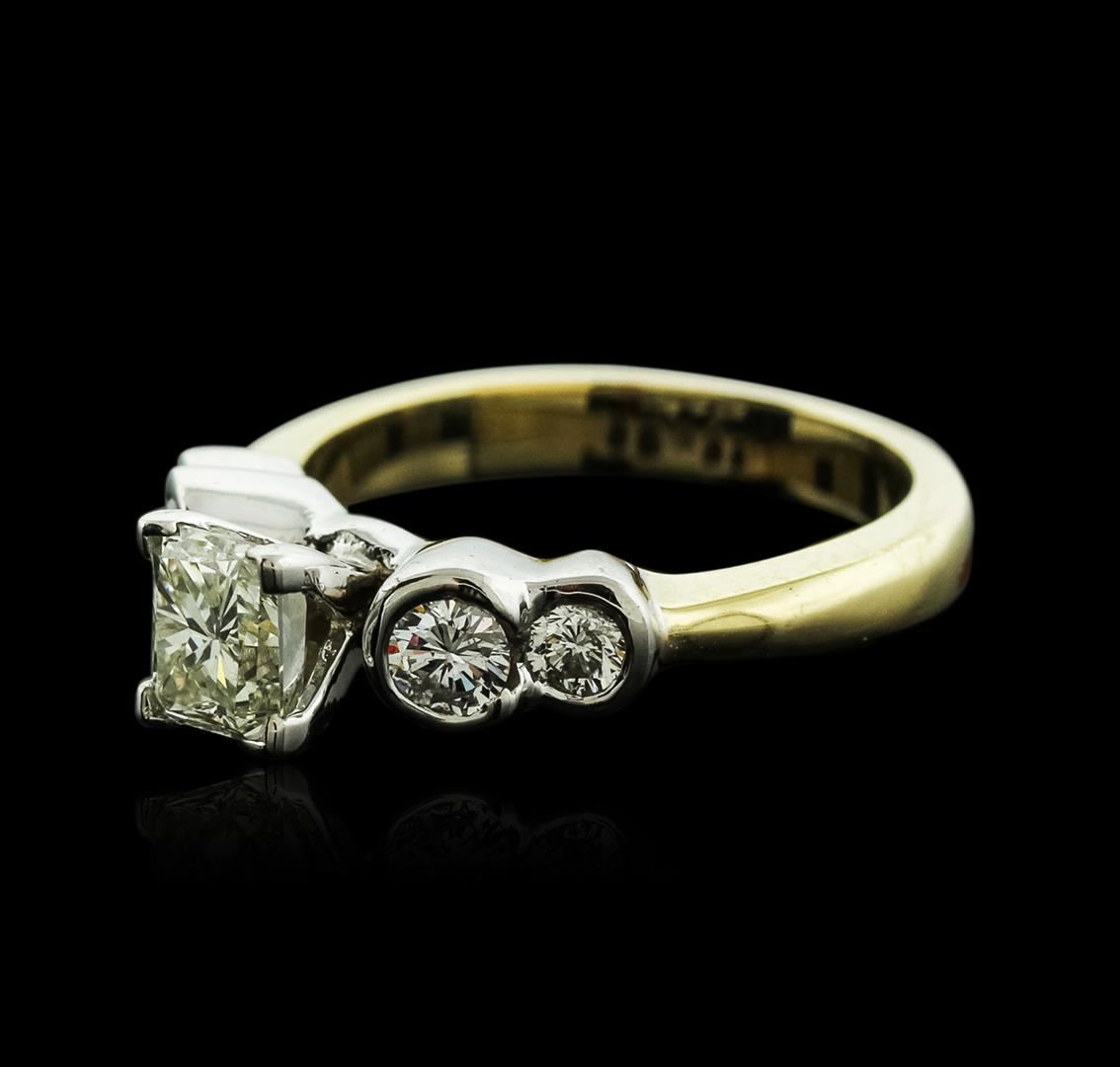 One electronically tested 14KT yellow and white gold ladies cast diamond engagement ring with a half round shank with a bright polish finish. Identified with markings of "14KP". Condition is new. Containing: One prong set radiant shaped cut diamond, measuring 5.49 x 4.61 x 3.46mm (depth est.) approximate weight of 0.72ct. Clarity: VS-2. Color: L. Two half bezel set round brilliant cut diamonds, measuring 3.50 - 3.50 x 2.10mm (depth est.) approximate total weight of 2 Stones = 0.31ct. Clarity: SI-2 to I-1. Color: G - H, Cut is Good. Two half bezel set round brilliant cut diamonds, measuring 2.50 - 2.50 x 1.50mm (depth est.) approximate total weight of 2 Stones = 0.11ct. Clarity: SI-2 to I-1. Color: H - I, Cut is Good. All diamonds are graded in the mounting, unless otherwise stated. Total Weight of Diamonds 1.15ct. Total Weight of Engagement Ring 5.50 grams. GGL Appraised at $6,105.00.