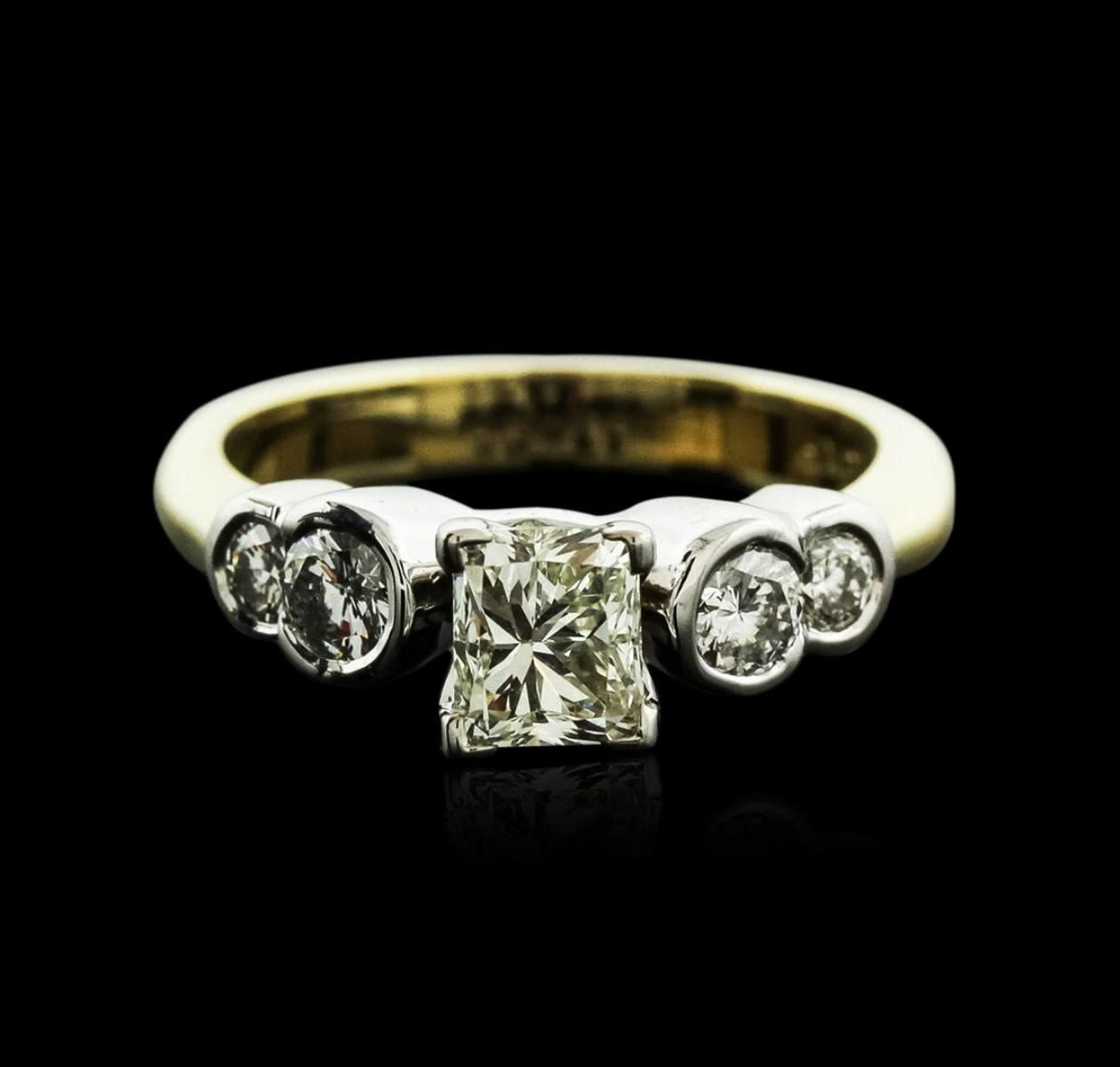 One electronically tested 14KT yellow and white gold ladies cast diamond engagement ring with a half round shank with a bright polish finish. Identified with markings of "14KP". Condition is new. Containing: One prong set radiant shaped cut diamond, measuring 5.49 x 4.61 x 3.46mm (depth est.) approximate weight of 0.72ct. Clarity: VS-2. Color: L. Two half bezel set round brilliant cut diamonds, measuring 3.50 - 3.50 x 2.10mm (depth est.) approximate total weight of 2 Stones = 0.31ct. Clarity: SI-2 to I-1. Color: G - H, Cut is Good. Two half bezel set round brilliant cut diamonds, measuring 2.50 - 2.50 x 1.50mm (depth est.) approximate total weight of 2 Stones = 0.11ct. Clarity: SI-2 to I-1. Color: H - I, Cut is Good. All diamonds are graded in the mounting, unless otherwise stated. Total Weight of Diamonds 1.15ct. Total Weight of Engagement Ring 5.50 grams. GGL Appraised.