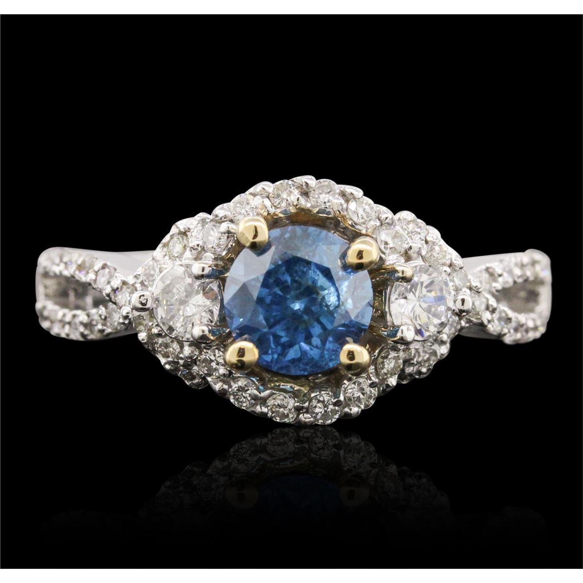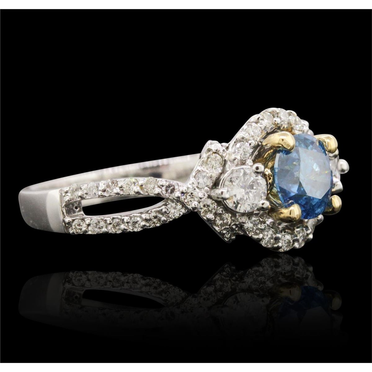 One electronically tested 14KT white and yellow gold ladies combination cast & assembled engagement ring with a bright polish finish. Condition is new. Identified with markings of "K14". Containing: One prong set round brilliant cut diamond, measuring 5.70 - 5.70 x 3.42mm (depth est.) approximate weight of 0.68ct. Clarity: I-2, Cut is Good. Color of the diamond has been enhanced. Forty-Eight prong set round brilliant cut diamonds, measuring 1.20 - 1.20 x 0.72mm (depth est.) approximate total weight of 48 Stones = 0.30ct. Clarity: I-1 to I-2. Color: I - J, Cut is Good. Two prong set round brilliant cut diamonds, measuring 3.00 - 3.00 x 1.80mm (depth est.) approximate total weight of 2 Stones = 0.20ct. Clarity: SI-1 to I-1. Color: I - J, Cut is Good. All diamonds are graded in the mounting, unless otherwise stated. Total Weight of Diamonds 1.18ct. Total Weight of Engagement Ring 4.60 grams. GGL Appraised at $5,660.00.