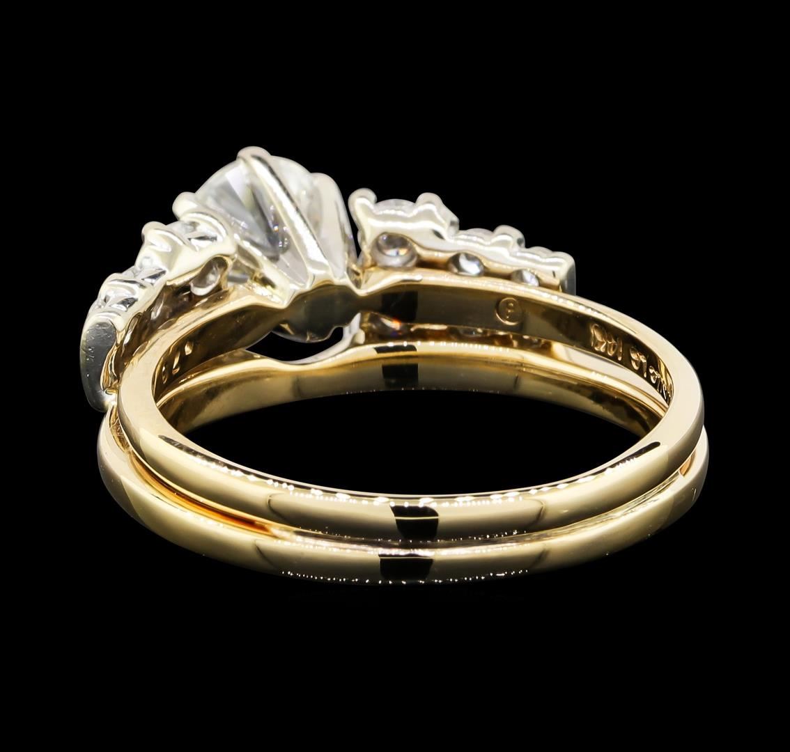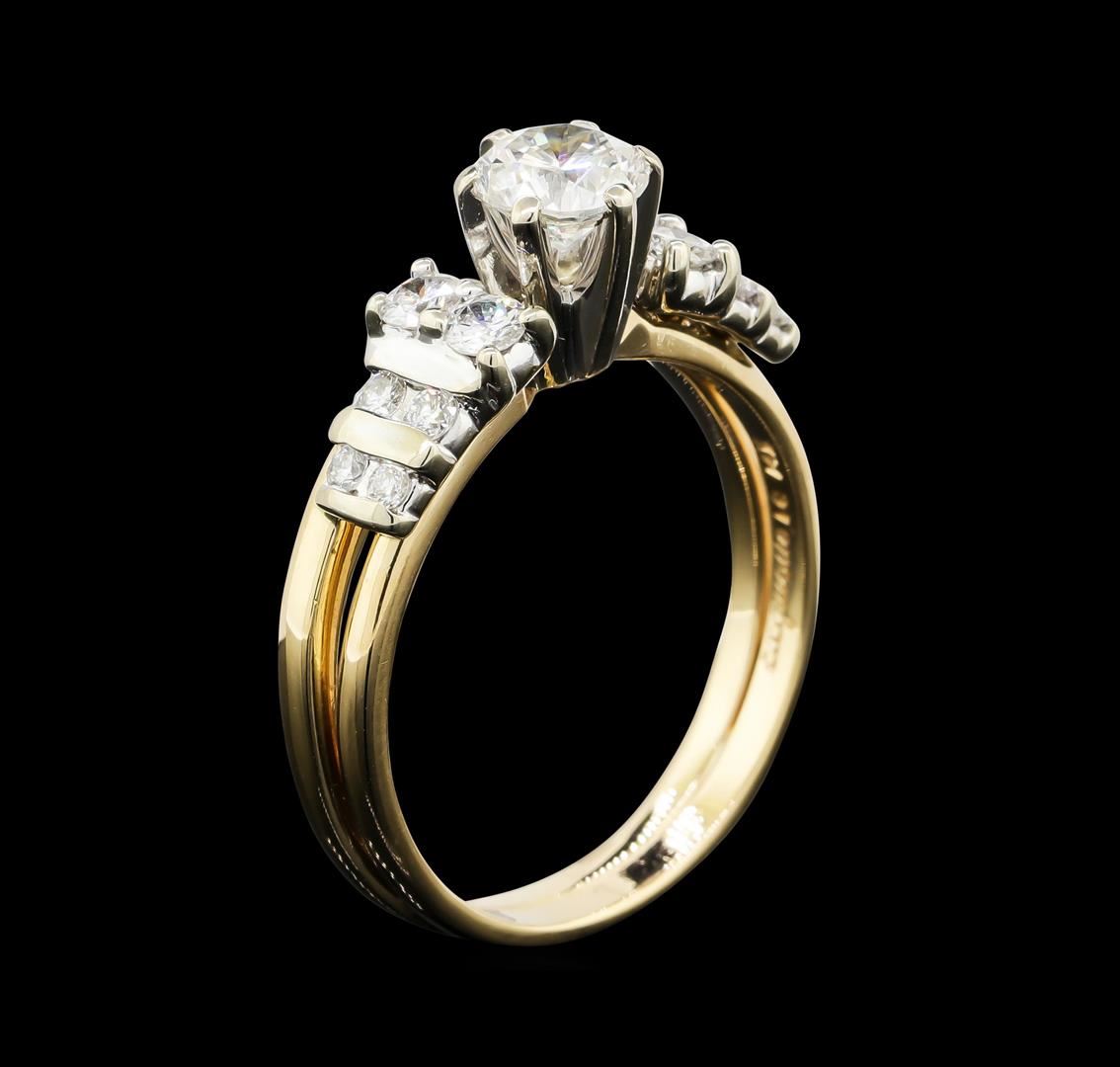 One set electronically tested 14KT yellow and white gold lady's combination cast & assembled wedding ring soldered to enhancer with a bright polish finish. The featured lady's wedding ring soldered to an enhance has a double shank measuring 3.23 millimeters wide. Identified with markings of "14K". Condition is new, good workmanship. Containing: One prong set round brilliant cut diamond, measuring 5.65 - 5.60 x 3.50mm (depth est.) approximate weight of 0.68ct. Graded in the setting. Clarity: VS-2. Color: H - ICut Very Good Four prong set round brilliant cut diamonds, measuring 2.90 - 2.80 x 1.77mm (depth est.) approximate total weight of 4 Stones = 0.35ct. Graded in the setting. Clarity: VS-2 to SI-2. Color: H - ICut Good Eight channel set round brilliant cut diamonds, measuring 1.90 - 1.70 x 1.12mm (depth est.) approximate total weight of 8 Stones = 0.18ct. Graded in the setting. Clarity: SI-1 to SI-2. Color: H - ICut Good. Total Weight of Diamonds 1.21ct. Total Weight of Ring Soldered To Enhancer 5.60gm. GAS Appraised.