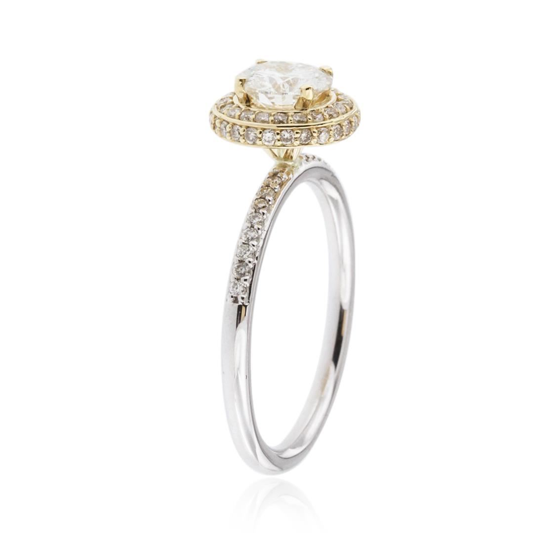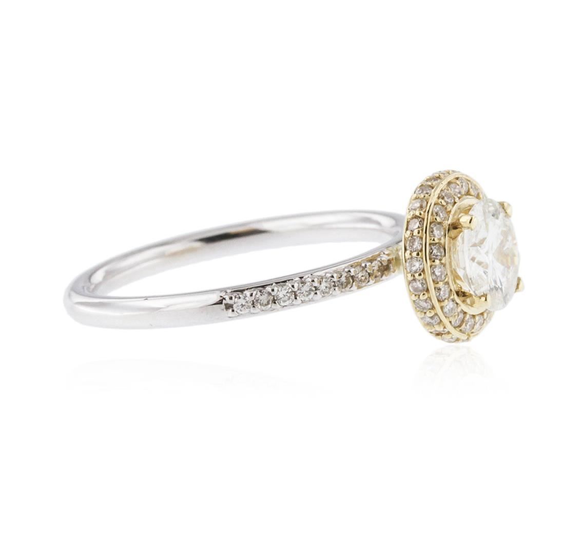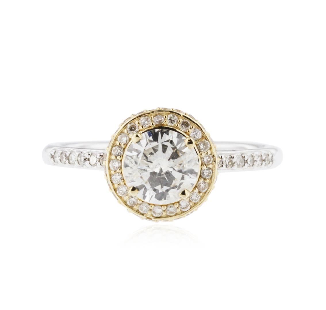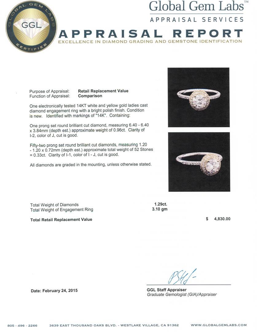 One electronically tested 14KT white and yellow gold ladies cast diamond engagement ring with a bright polish finish. Identified with markings of "14K". Condition is new. Containing: One prong set round brilliant cut diamond, measuring 6.40 - 6.40 x 3.84mm (depth est.) approximate weight of 0.96ct. Clarity: I-2. Color: J, Cut is Good. Fifty-Two prong set round brilliant cut diamonds, measuring 1.20 - 1.20 x 0.72mm (depth est.) approximate total weight of 52 Stones = 0.33ct. Clarity: I-1. Color: I - J, Cut is Good. All diamonds are graded in the mounting, unless otherwise stated. Total Weight of Diamonds 1.29ct. Total Weight of Engagement Ring 3.10 grams. GGL Appraised at $4,830.00.