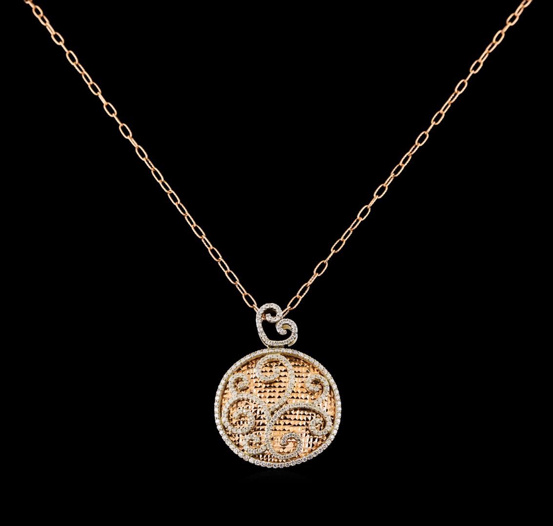 One electronically tested 14KT white and rose gold ladies cast & assembled diamond pendant with chain. The pendant features swirling white gold diamond ribbons and diamond bezel set within a rose gold background with diamond cut accents, completed by a white gold diamond set bail. The pendant is supported by an eighteen inch length 14KT rose gold link chain with milgrain detailing, terminating in a lobster claw clasp. Bright polish finish. Identified with markings of "K14". Condition is new, good workmanship. Containing: Two Hundred Seventeen prong set round brilliant cut diamonds, measuring 1.20 - 1.10 x 0.69mm (depth est.) approximate total weight of 217 Stones = 1.30ct. Graded in the setting. Clarity: SI-2 to I-1. Color: G - I. Total Weight of Diamonds 1.30ct. Total Weight of Pendant With Chain 19.22 grams. AIG Appraised at $8,375.00.