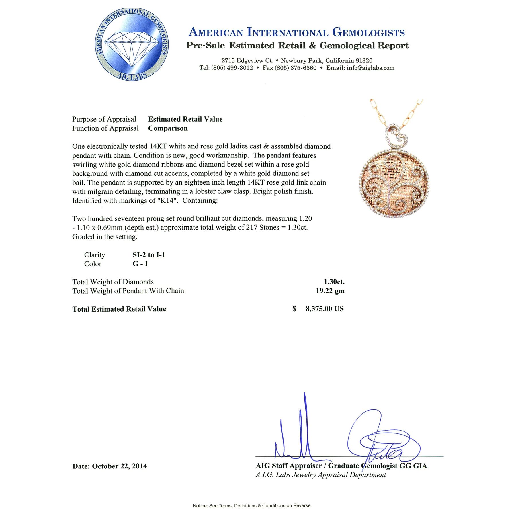 One electronically tested 14KT white and rose gold ladies cast & assembled diamond pendant with chain. The pendant features swirling white gold diamond ribbons and diamond bezel set within a rose gold background with diamond cut accents, completed by a white gold diamond set bail. The pendant is supported by an eighteen inch length 14KT rose gold link chain with milgrain detailing, terminating in a lobster claw clasp. Bright polish finish. Identified with markings of "K14". Condition is new, good workmanship. Containing: Two Hundred Seventeen prong set round brilliant cut diamonds, measuring 1.20 - 1.10 x 0.69mm (depth est.) approximate total weight of 217 Stones = 1.30ct. Graded in the setting. Clarity: SI-2 to I-1. Color: G - I. Total Weight of Diamonds 1.30ct. Total Weight of Pendant With Chain 19.22 grams. AIG Appraised at $8,375.00.