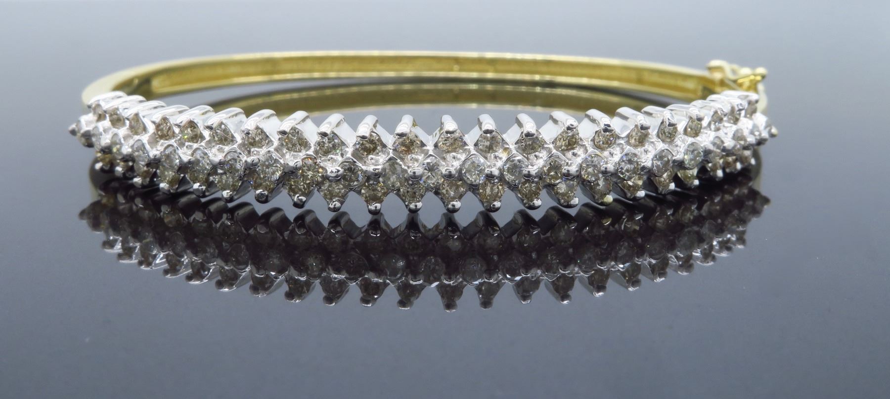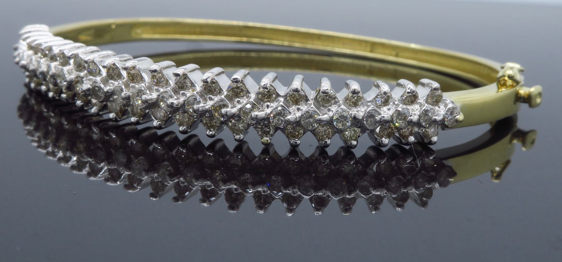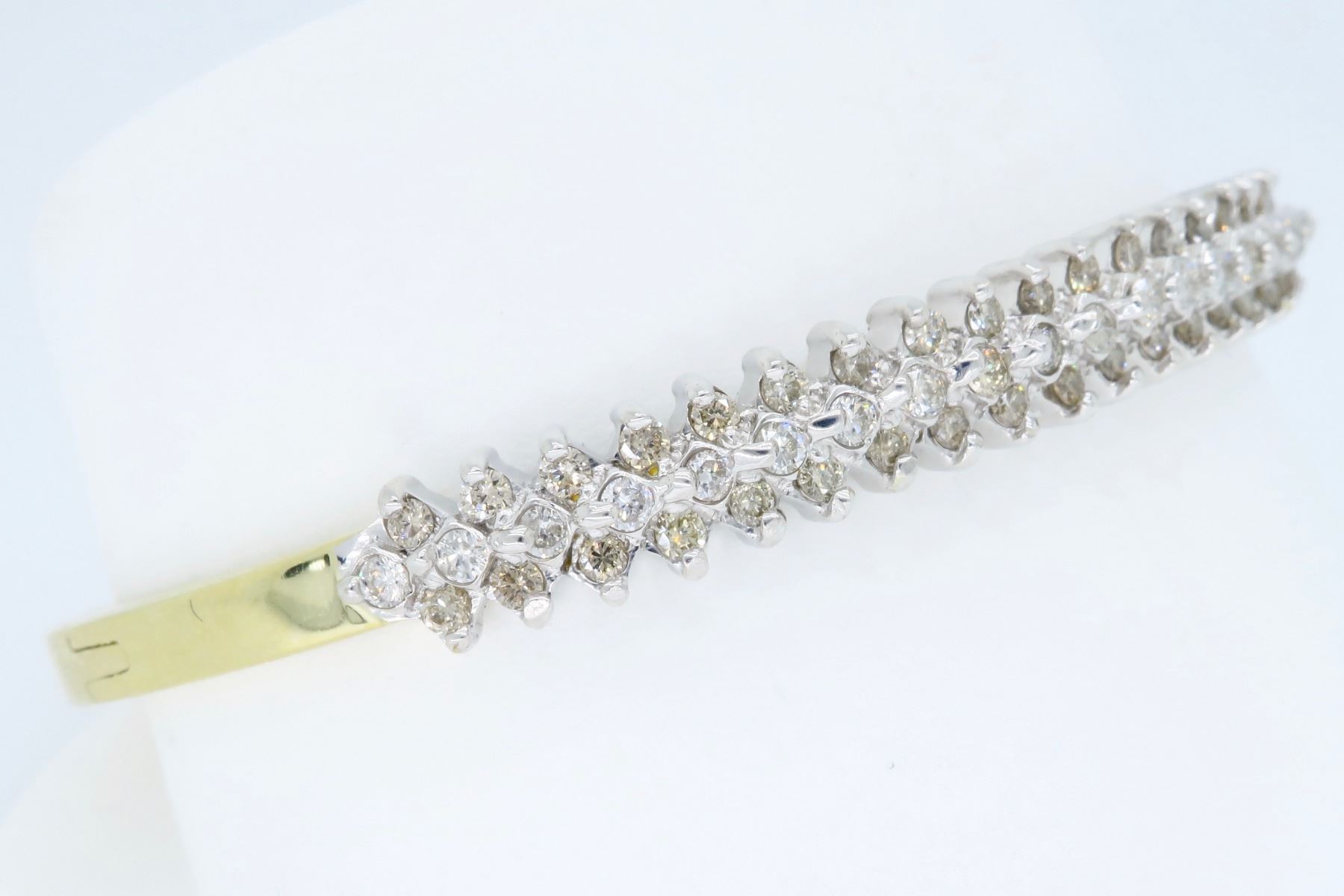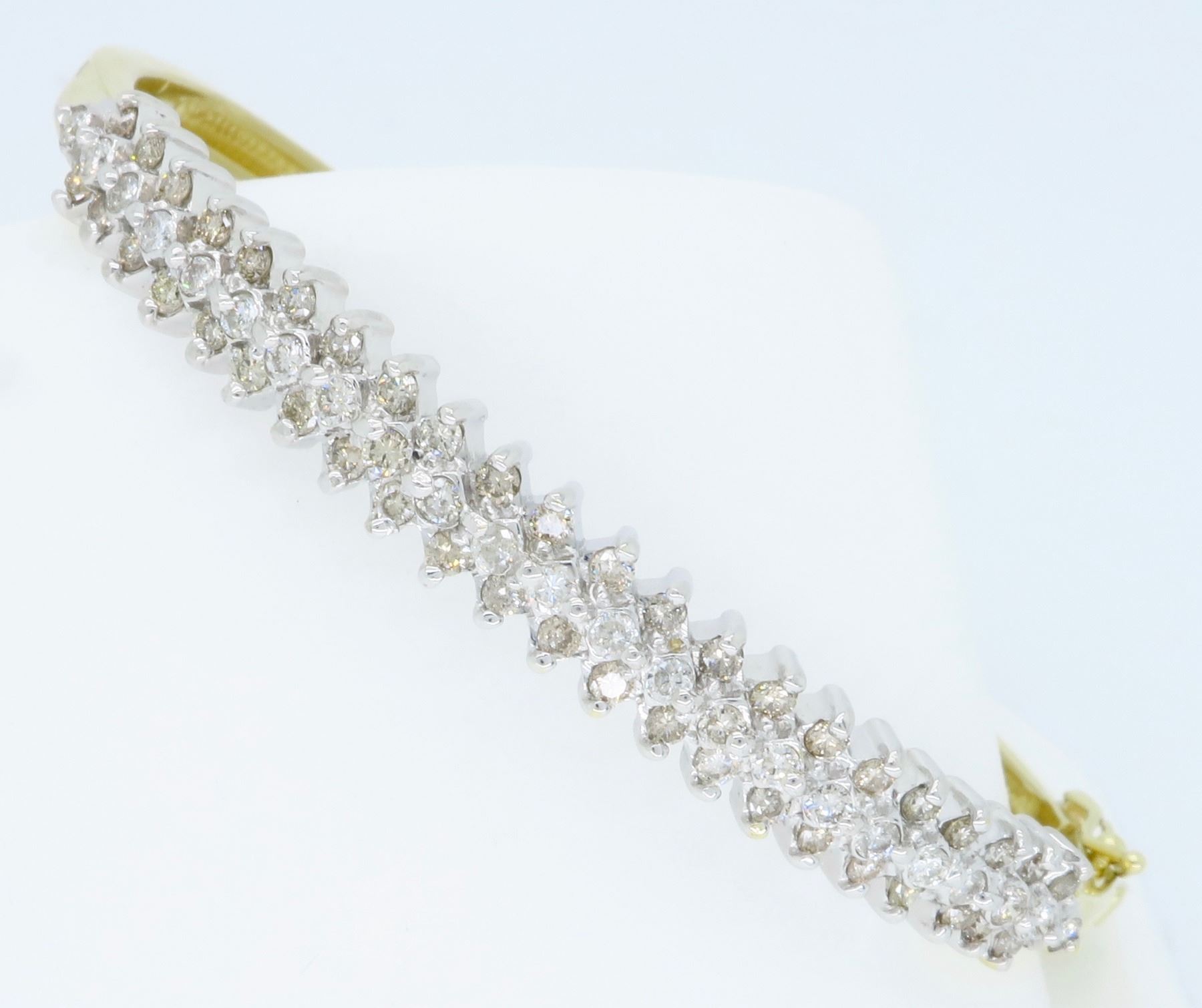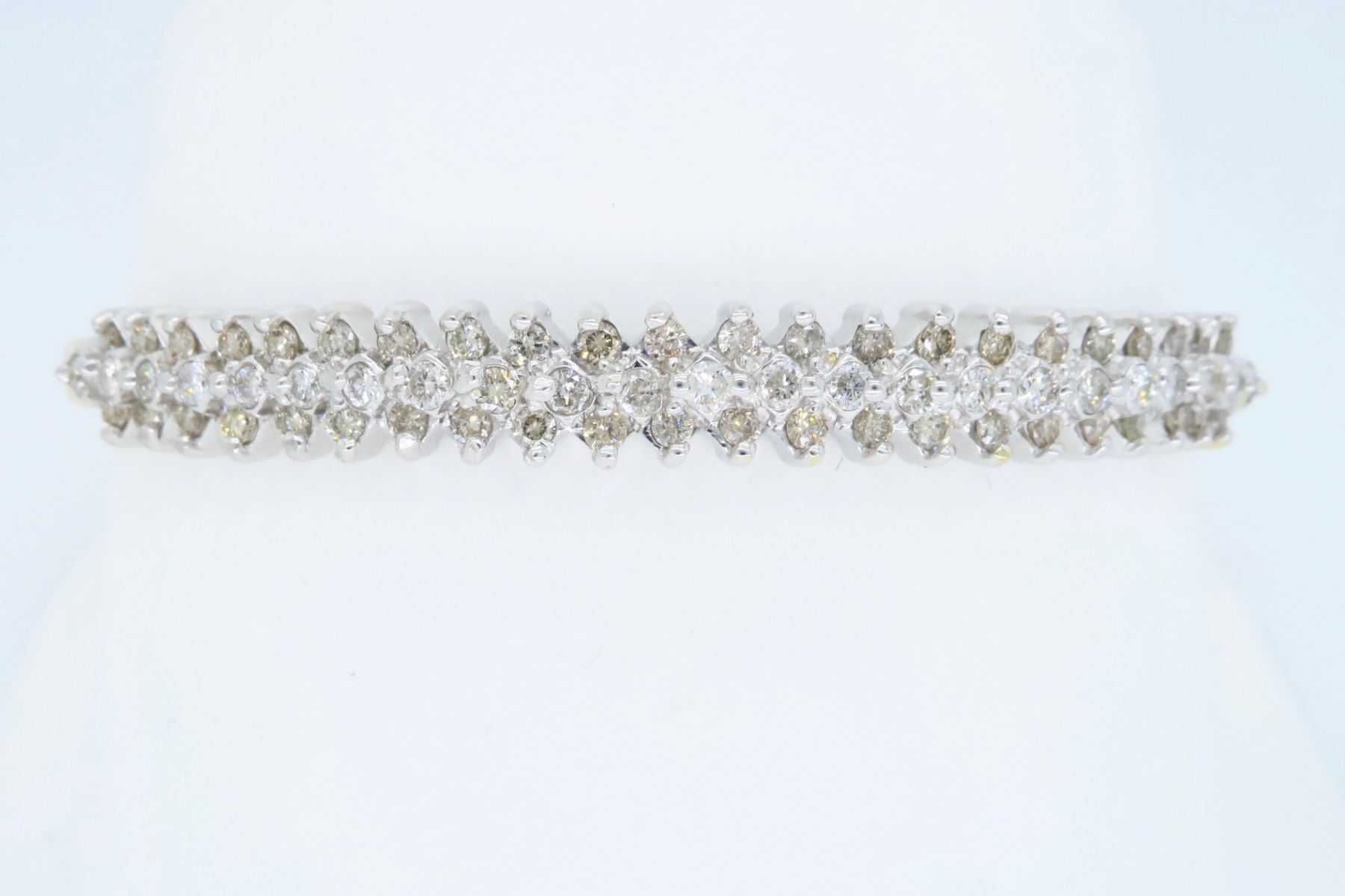 One 14KT Two Tone Gold 1.30ctw Diamond Bracelet. (67) Round Diamonds with a total weight of 1.30cts with a color of light brown and clarity of SI-1 to SI-2. Total weight of this bracelet is 16.2 grams. Total length of this bracelet is 7 inches.