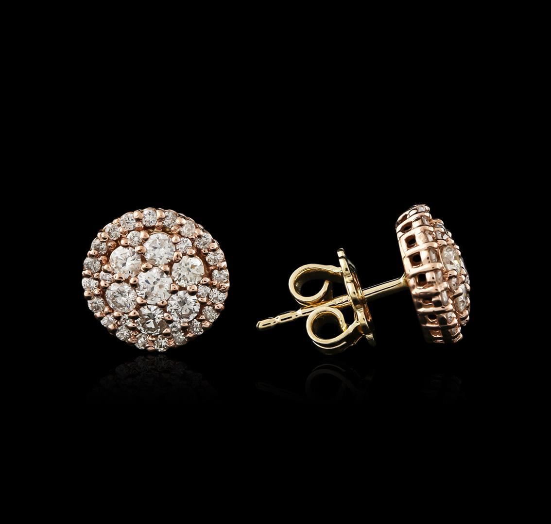 One pair electronically tested 14KT rose and yellow gold ladies cast diamond earrings with friction posts with a bright polish finish. Identified with markings of "585". Condition is new. Containing: Fourteen prong set round brilliant cut diamonds, measuring 1.80 - 1.80 x 1.08mm (depth est.) approximate total weight of 14 Stones = 0.95ct. Clarity: SI-2 to I-1. Color: G - H, Cut is Good. Fifty-Two prong set round brilliant cut diamonds, measuring 1.20 - 1.20 x 0.72mm (depth est.) approximate total weight of 52 Stones = 0.36ct. Clarity: SI-2 to I-2. Color: H - I, Cut is Good. Diamonds are graded in the mounting, unless otherwise stated. Total Weight of Diamonds 1.31ct. Total Weight of Earrings 3.40 grams. GGL Appraised.