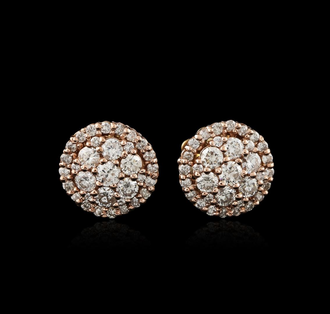 One pair electronically tested 14KT rose and yellow gold ladies cast diamond earrings with friction posts with a bright polish finish. Identified with markings of "585". Condition is new. Containing: Fourteen prong set round brilliant cut diamonds, measuring 1.80 - 1.80 x 1.08mm (depth est.) approximate total weight of 14 Stones = 0.95ct. Clarity: SI-2 to I-1. Color: G - H, Cut is Good. Fifty-Two prong set round brilliant cut diamonds, measuring 1.20 - 1.20 x 0.72mm (depth est.) approximate total weight of 52 Stones = 0.36ct. Clarity: SI-2 to I-2. Color: H - I, Cut is Good. Diamonds are graded in the mounting, unless otherwise stated. Total Weight of Diamonds 1.31ct. Total Weight of Earrings 3.40 grams. GGL Appraised at $2,300.00.