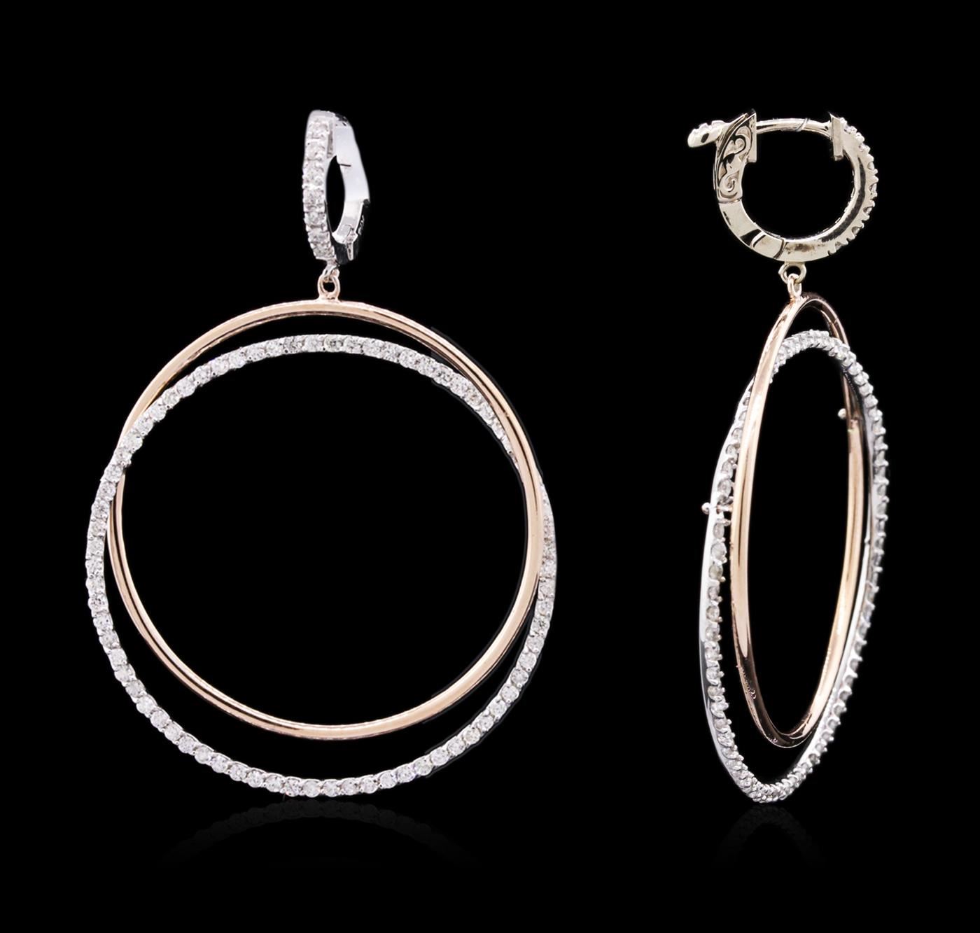 One pair electronically tested 14KT white and rose gold ladies cast diamond earrings with hinged clip backs with a bright polish finish. Identified with markings of "K14". Condition is new. Containing: One Hundred Sixty-Eight prong set round brilliant cut diamonds, measuring 1.30 - 1.30 x 0.78mm (depth est.) approximate total weight of 168 Stones = 1.34ct. Clarity: SI-1 to I-1. Color: I - J, Cut is Good. All diamonds are graded in the mounting, unless otherwise stated. Total Weight of Diamonds 1.34ct. Total Weight of Earrings 10.30 grams. GGL Appraised at $5,995.00.