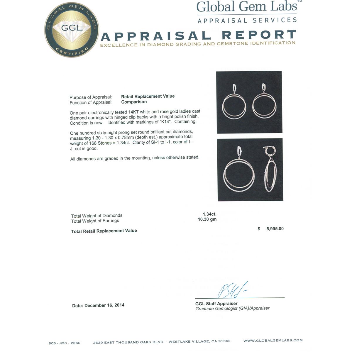 One pair electronically tested 14KT white and rose gold ladies cast diamond earrings with hinged clip backs with a bright polish finish. Identified with markings of "K14". Condition is new. Containing: One Hundred Sixty-Eight prong set round brilliant cut diamonds, measuring 1.30 - 1.30 x 0.78mm (depth est.) approximate total weight of 168 Stones = 1.34ct. Clarity: SI-1 to I-1. Color: I - J, Cut is Good. All diamonds are graded in the mounting, unless otherwise stated. Total Weight of Diamonds 1.34ct. Total Weight of Earrings 10.30 grams. GGL Appraised at $5,995.00.