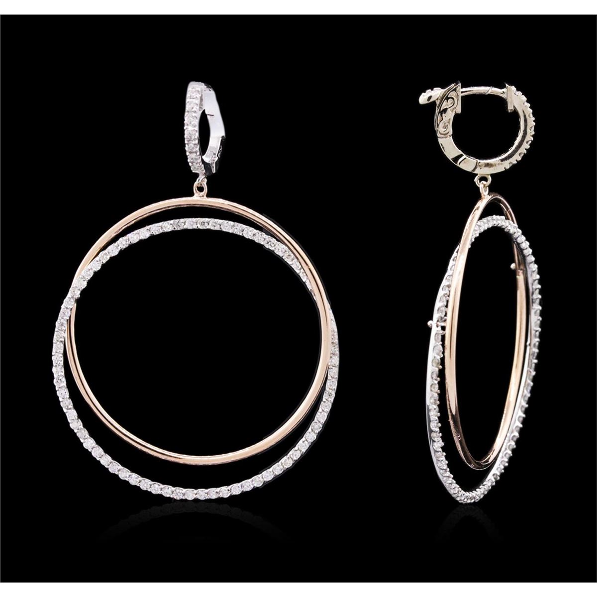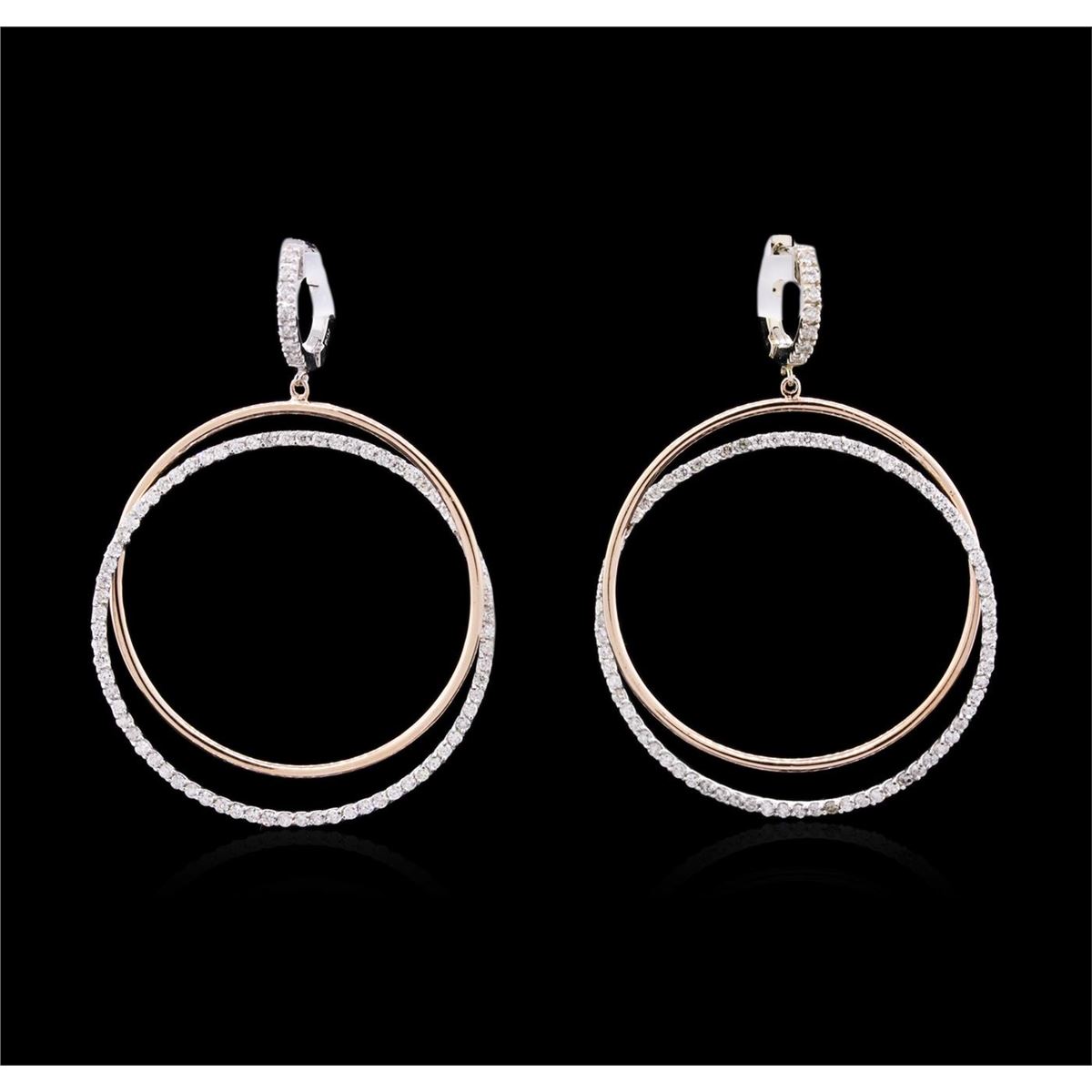 One pair electronically tested 14KT white and rose gold ladies cast diamond earrings with hinged clip backs with a bright polish finish. Identified with markings of "K14". Condition is new. Containing: One Hundred Sixty-Eight prong set round brilliant cut diamonds, measuring 1.30 - 1.30 x 0.78mm (depth est.) approximate total weight of 168 Stones = 1.34ct. Clarity: SI-1 to I-1. Color: I - J, Cut is Good. All diamonds are graded in the mounting, unless otherwise stated. Total Weight of Diamonds 1.34ct. Total Weight of Earrings 10.30 grams. GGL Appraised at $5,995.00.