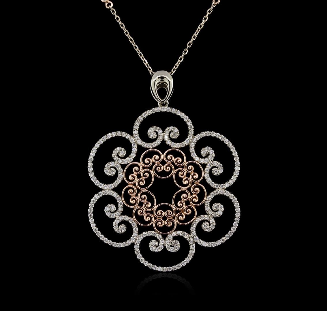One electronically tested 14KT white and rose gold ladies cast diamond pendant & chain 16.0" long, with a lobster claw clasp with a bright polish finish. Identified with markings of "14K". Condition is new. Containing: Two Hundred Forty-Six prong set round brilliant cut diamonds, measuring 1.30 - 1.10 x 0.00mm (depth est.) approximate total weight of 246 Stones = 1.42ct. Clarity: I-1 to I-2. Color: I - J, Cut is Good. Diamonds are graded in the mounting, unless otherwise stated. Total Weight of Diamonds 1.42ct. Total Weight of Pendant & Chain 16.40 grams. GGL Appraised at $4,135.00.