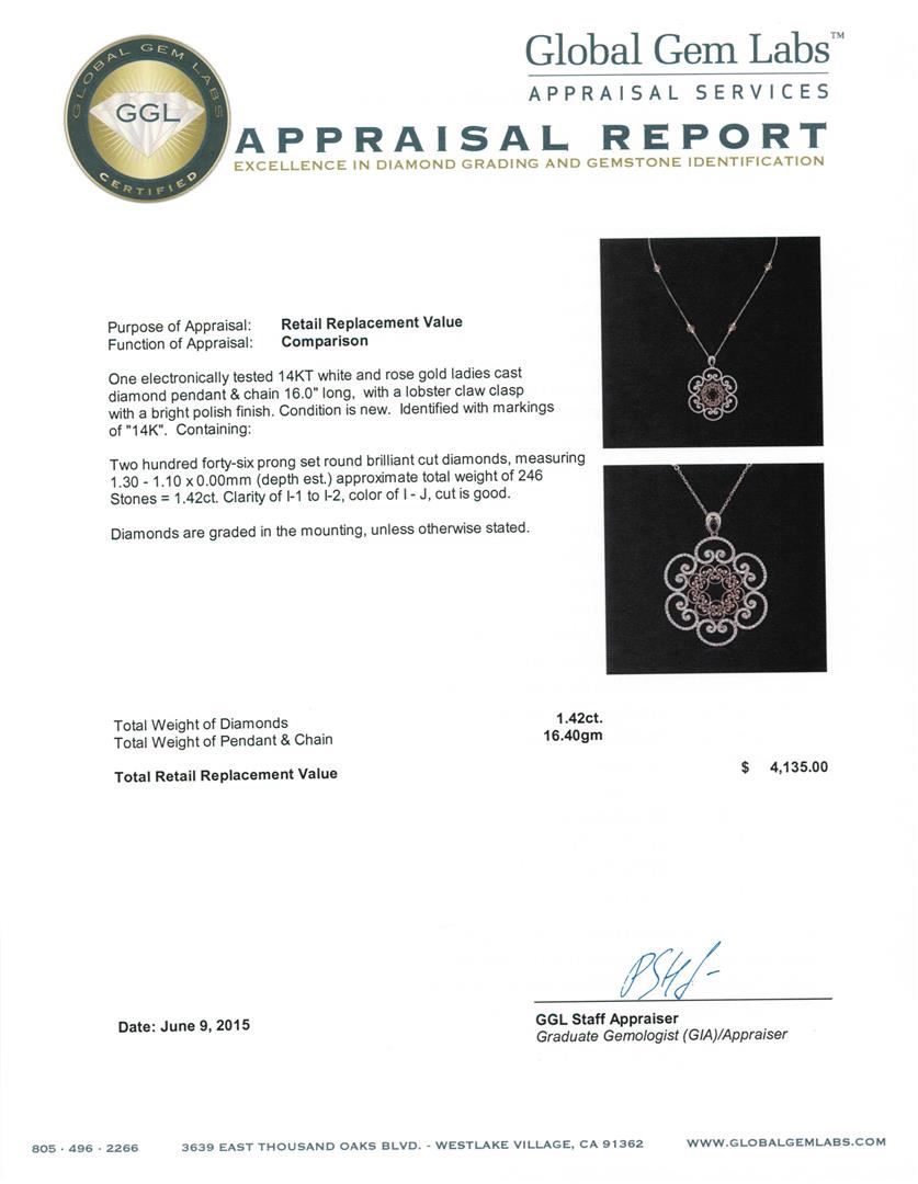 One electronically tested 14KT white and rose gold ladies cast diamond pendant & chain 16.0" long, with a lobster claw clasp with a bright polish finish. Identified with markings of "14K". Condition is new. Containing: Two Hundred Forty-Six prong set round brilliant cut diamonds, measuring 1.30 - 1.10 x 0.00mm (depth est.) approximate total weight of 246 Stones = 1.42ct. Clarity: I-1 to I-2. Color: I - J, Cut is Good. Diamonds are graded in the mounting, unless otherwise stated. Total Weight of Diamonds 1.42ct. Total Weight of Pendant & Chain 16.40 grams. GGL Appraised at $4,135.00.