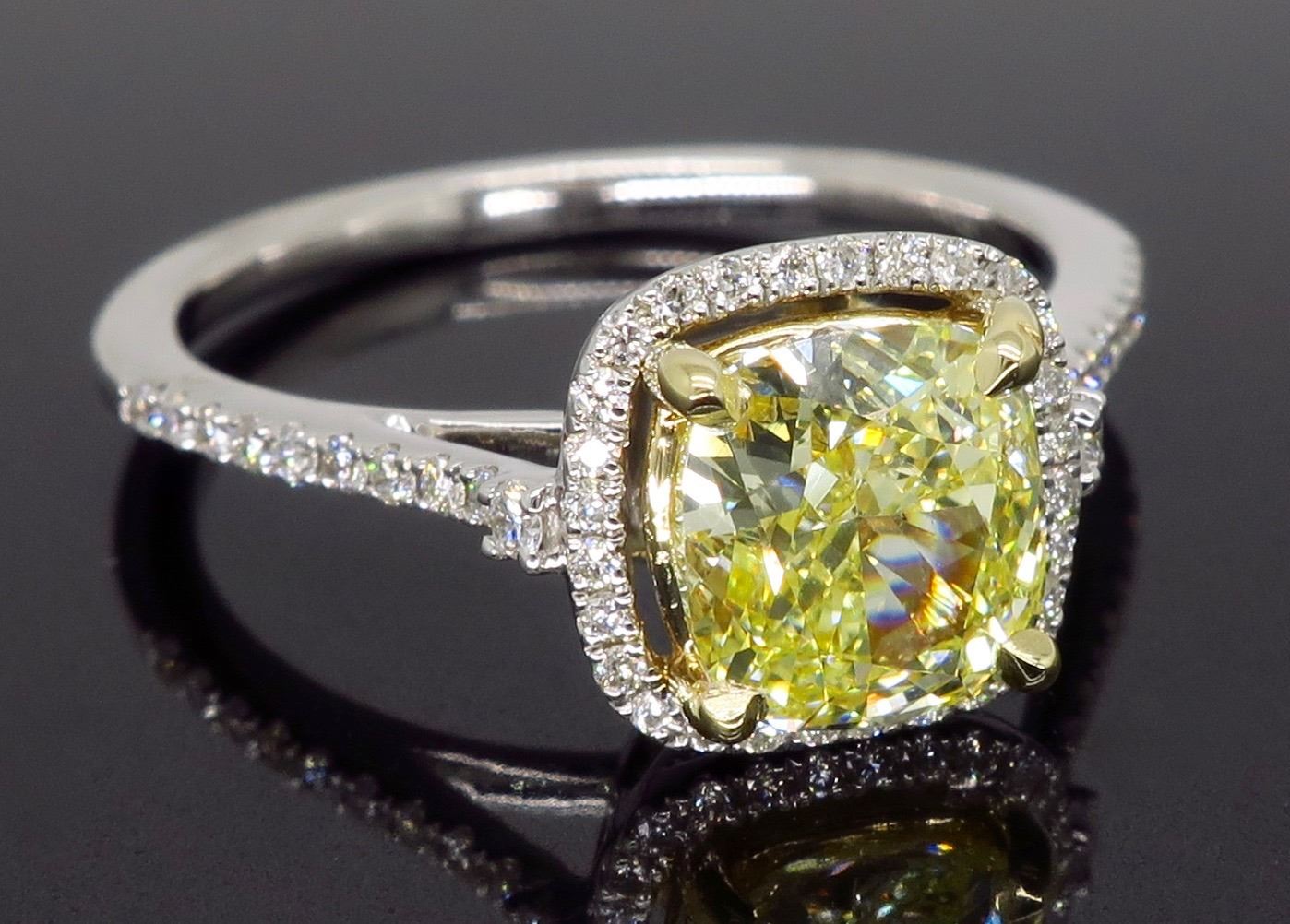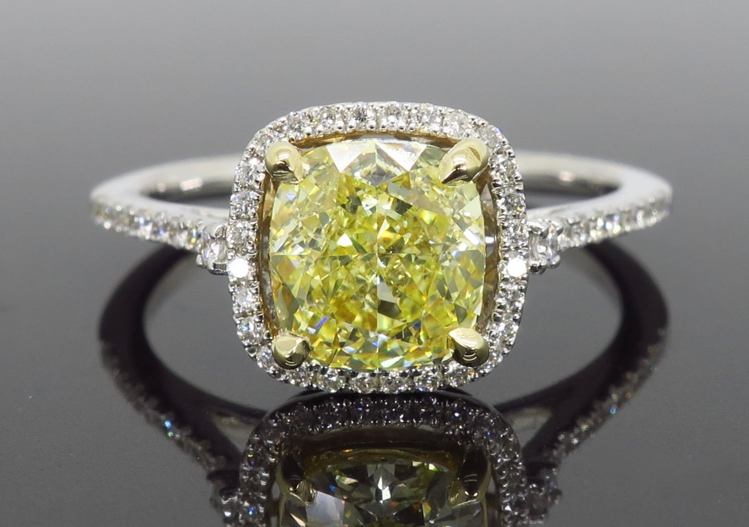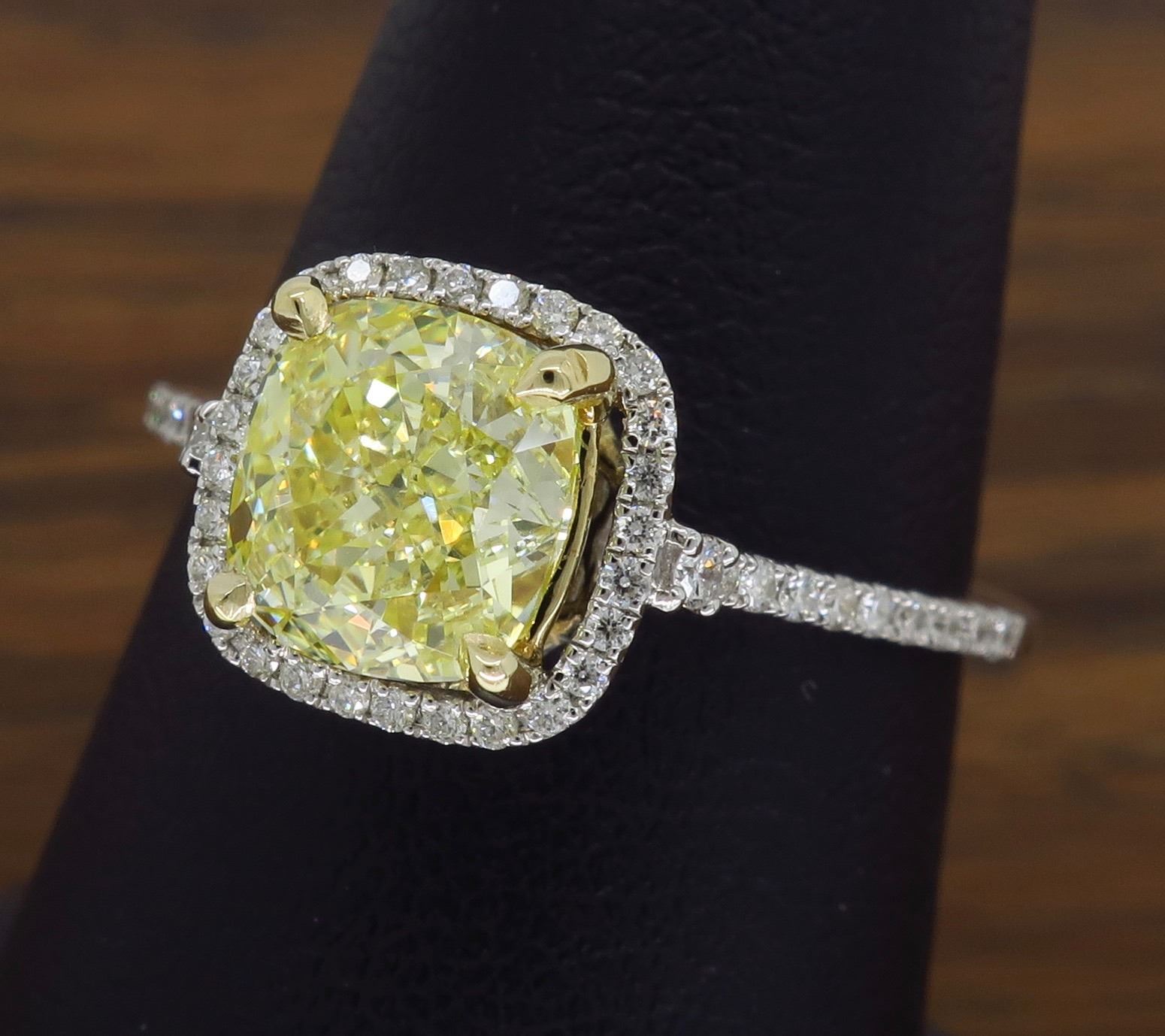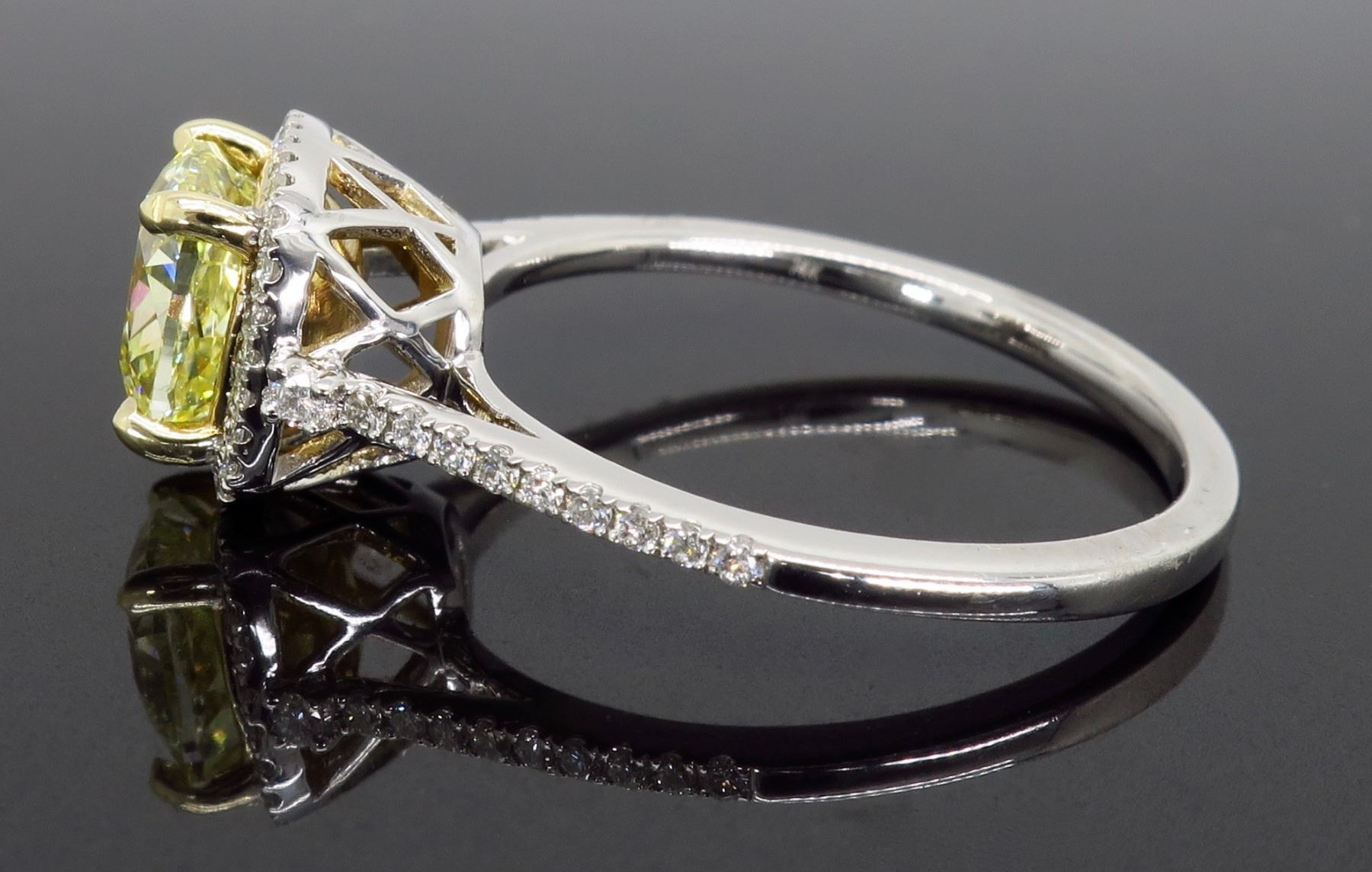 One 14KT Two Tone Gold 1.42ct Fancy Light Yellow Diamond Ring. (1) GIA Certified Cushion modified brilliant Fancy light Yellow Diamond with a total weight of 1.42cts with a clarity of VS-2. (48) round diamonds with a total weight of 0.22cts with a color of G-I and clarity of VS-2. Total weight of this ring is 2.8 grams. Ring size is 6.5.