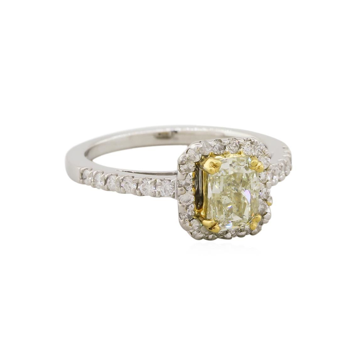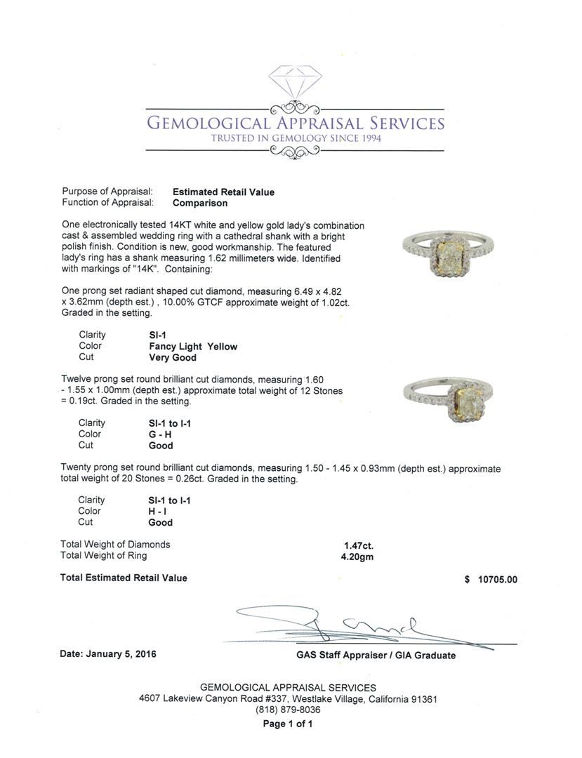 One electronically tested 14KT white and yellow gold lady's combination cast & assembled wedding ring with a cathedral shank with a bright polish finish. The featured lady's ring has a shank measuring 1.62 millimeters wide. Identified with markings of "14K". Condition is new, good workmanship. Containing: One prong set radiant shaped cut diamond, measuring 6.49 x 4.82 x 3.62mm (depth est.) , 10.00.%. GTCF approximate weight of 1.02ct. Graded in the setting. Clarity: SI-1 Cut Very Good Twelve prong set round brilliant cut diamonds, measuring 1.60 - 1.55 x 1.00mm (depth est.) approximate total weight of 12 Stones = 0.19ct. Graded in the setting. Clarity: SI-1 to I-1. Color: G - Good Twenty prong set round brilliant cut diamonds, measuring 1.50 - 1.45 x 0.93mm (depth est.) approximate total weight of 20 Stones = 0.26ct. Graded in the setting. Clarity: SI-1 to I-1. Color: H - I. Cut Good. Total Weight of Diamonds 1.47ct. Total Weight of Ring 4.20gm. GAS Appraised at $10,705.00.