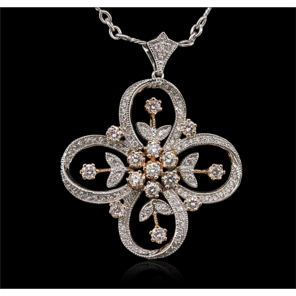 One electronically tested 14KT white and rose gold ladies combination cast & assembled pendant & chain 16.0" long, light fancy link with a lobster claw clasp with a bright polish finish. Condition is new. Identified with markings of "14K". Containing: Fifteen prong set round brilliant cut diamonds, measuring 2.50 - 2.50 x 1.50mm (depth est.) approximate. Total Weight of 15 Stones = 0.86ct. Clarity: SI-1. Color: H - I, Cut is Good. Ninety-Nine prong set round brilliant cut diamonds, measuring 1.30 - 1.10 x 0.72mm (depth est.) approximate. Total Weight of 99 Stones = 0.62ct. Clarity: SI-2 to I-1. Color: H - I, Cut is Good. All diamonds are graded in the mounting, unless otherwise stated. Total Weight of Diamonds 1.48ct. Total Weight of Pendant & Chain 11.50 grams. GGL Appraised at $8,615.00.