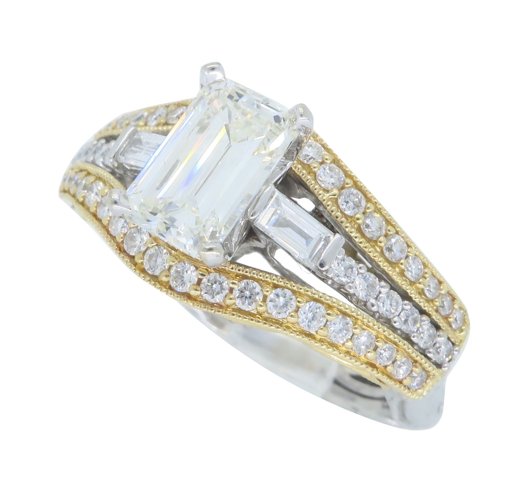 One 14KT Two Tone Gold 1.50ctw Diamond Ring. (1) Emerald cut Diamond with a total weight of 1.00cts with a color of I-J and clarity of VS-2. (2) baguette cut and (54) round Diamonds with a total weight of 0.50cts. Total weight of this ring is 4.8 grams. Ring size is 5.5.
