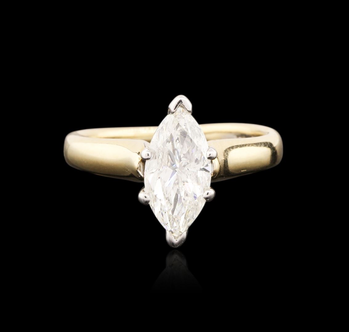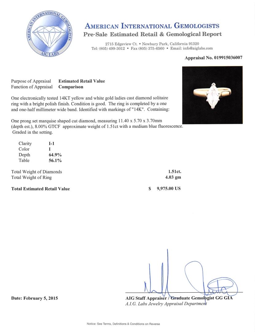One electronically tested 14KT yellow and white gold ladies cast diamond solitaire ring with a bright polish finish. The ring is completed by a one and one-half millimeter wide band. Identified with markings of "14K". Condition is good. Containing: One prong set marquise shaped cut diamond, measuring 11.40 x 5.70 x 3.70mm (depth est.), 8.00.%. GTCF approximate weight of 1.51ct with a medium blue fluorescence. Graded in the setting. Clarity: I-1. Color: I. Depth 64.9%. Table 56.1%. Total Weight of Diamonds 1.51ct. Total Weight of Ring 4.03 grams. AIG Appraised at $9,975.00.