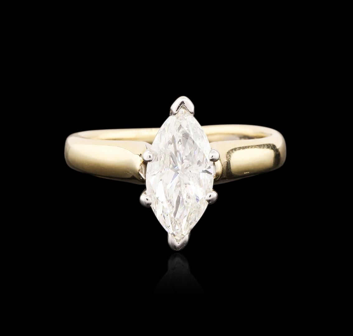 One electronically tested 14KT yellow and white gold ladies cast diamond solitaire ring with a bright polish finish. The ring is completed by a one and one-half millimeter wide band. Identified with markings of "14K". Condition is good. Containing: One prong set marquise shaped cut diamond, measuring 11.40 x 5.70 x 3.70mm (depth est.), 8.00.%. GTCF approximate weight of 1.51ct with a medium blue fluorescence. Graded in the setting. Clarity: I-1. Color: I. Depth 64.9%. Table 56.1%. Total Weight of Diamonds 1.51ct. Total Weight of Ring 4.03 grams. AIG Appraised at $9,975.00.