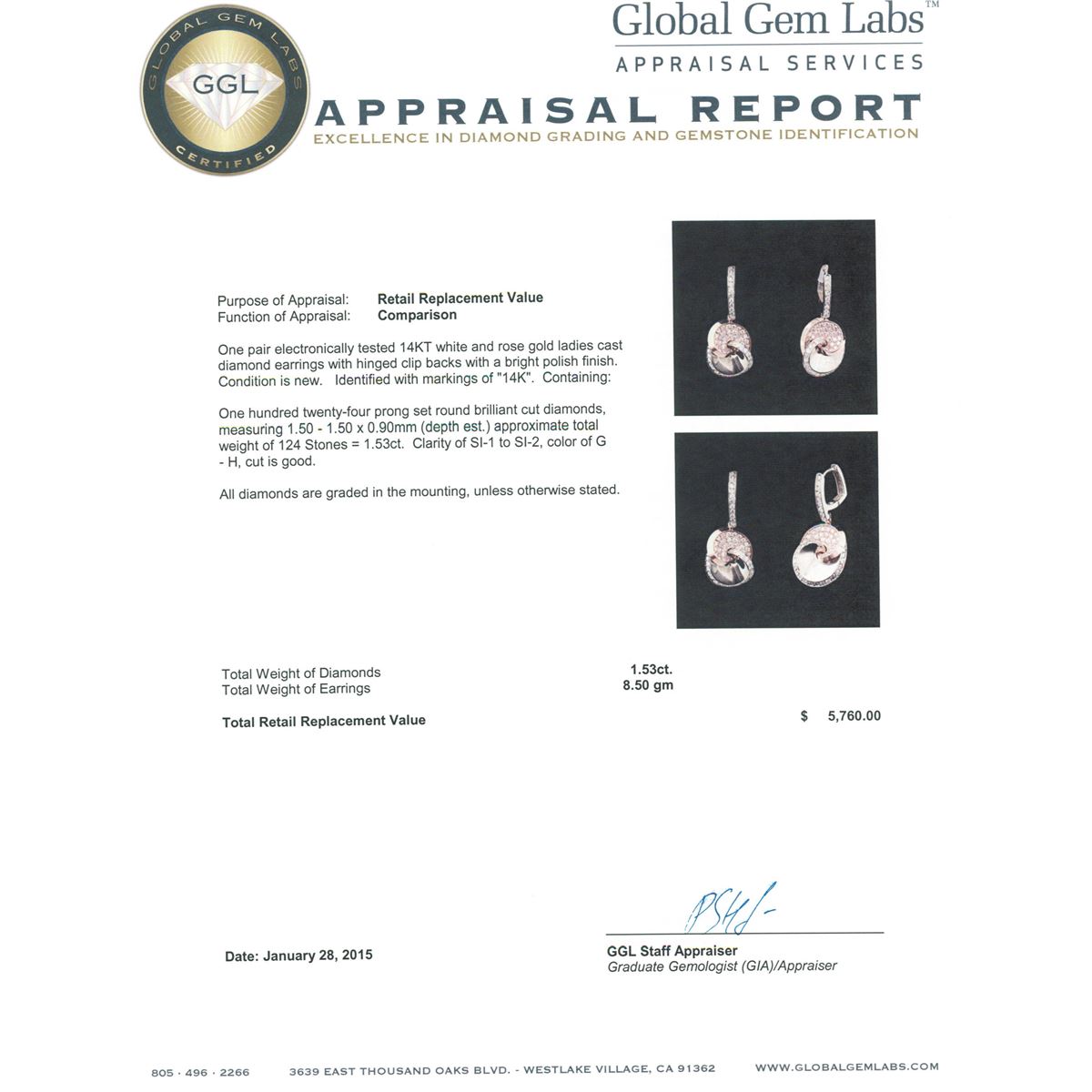 One pair electronically tested 14KT white and rose gold ladies cast diamond earrings with hinged clip backs with a bright polish finish. Identified with markings of "14K". Condition is new. Containing: One Hundred Twenty-Four prong set round brilliant cut diamonds, measuring 1.50 - 1.50 x 0.90mm (depth est.) approximate total weight of 124 Stones = 1.53ct. Clarity: SI-1 to SI-2. Color: G - H, Cut is Good. All diamonds are graded in the mounting, unless otherwise stated. Total Weight of Diamonds 1.53ct. Total Weight of Earrings 8.50 grams. GGL Appraised at $5,760.00.