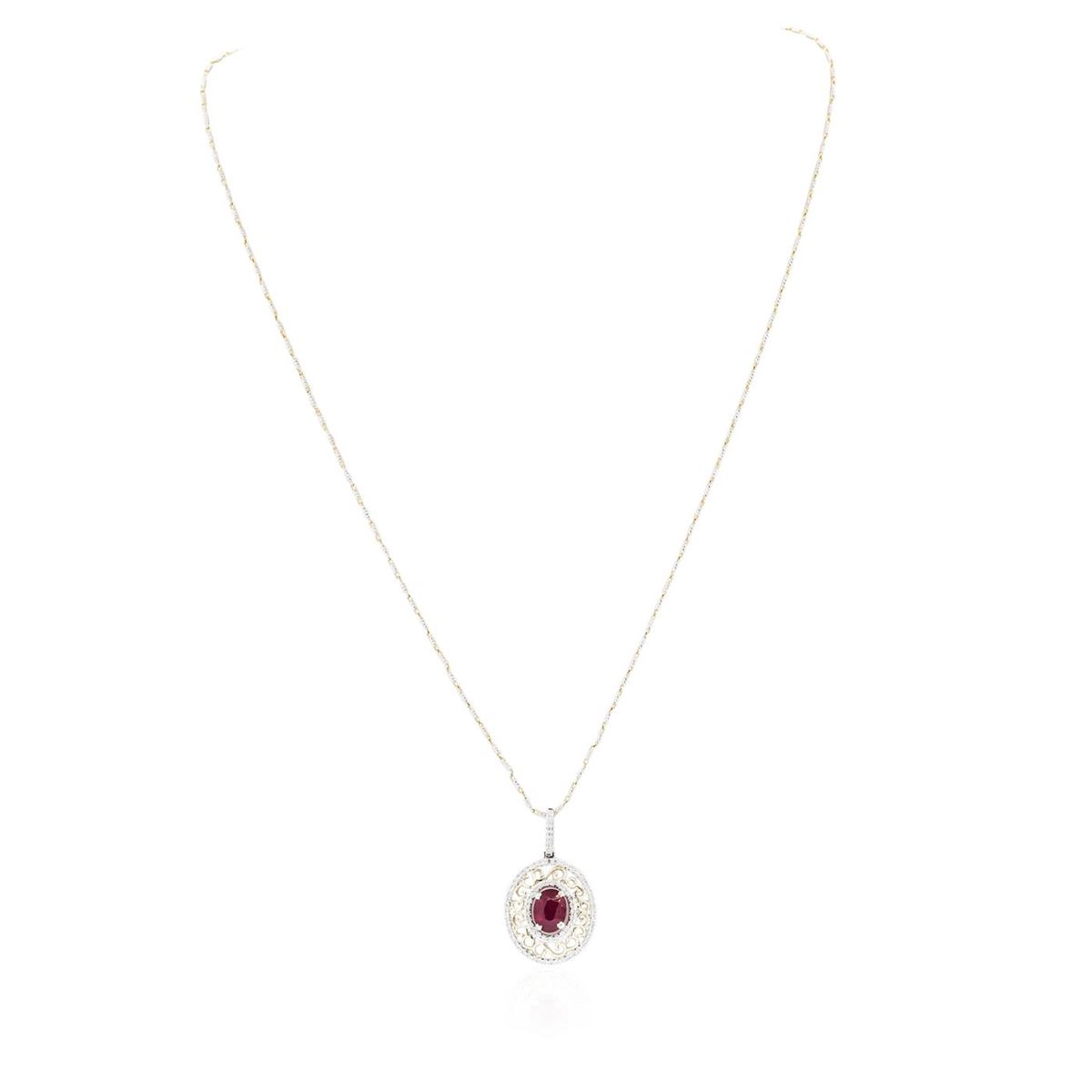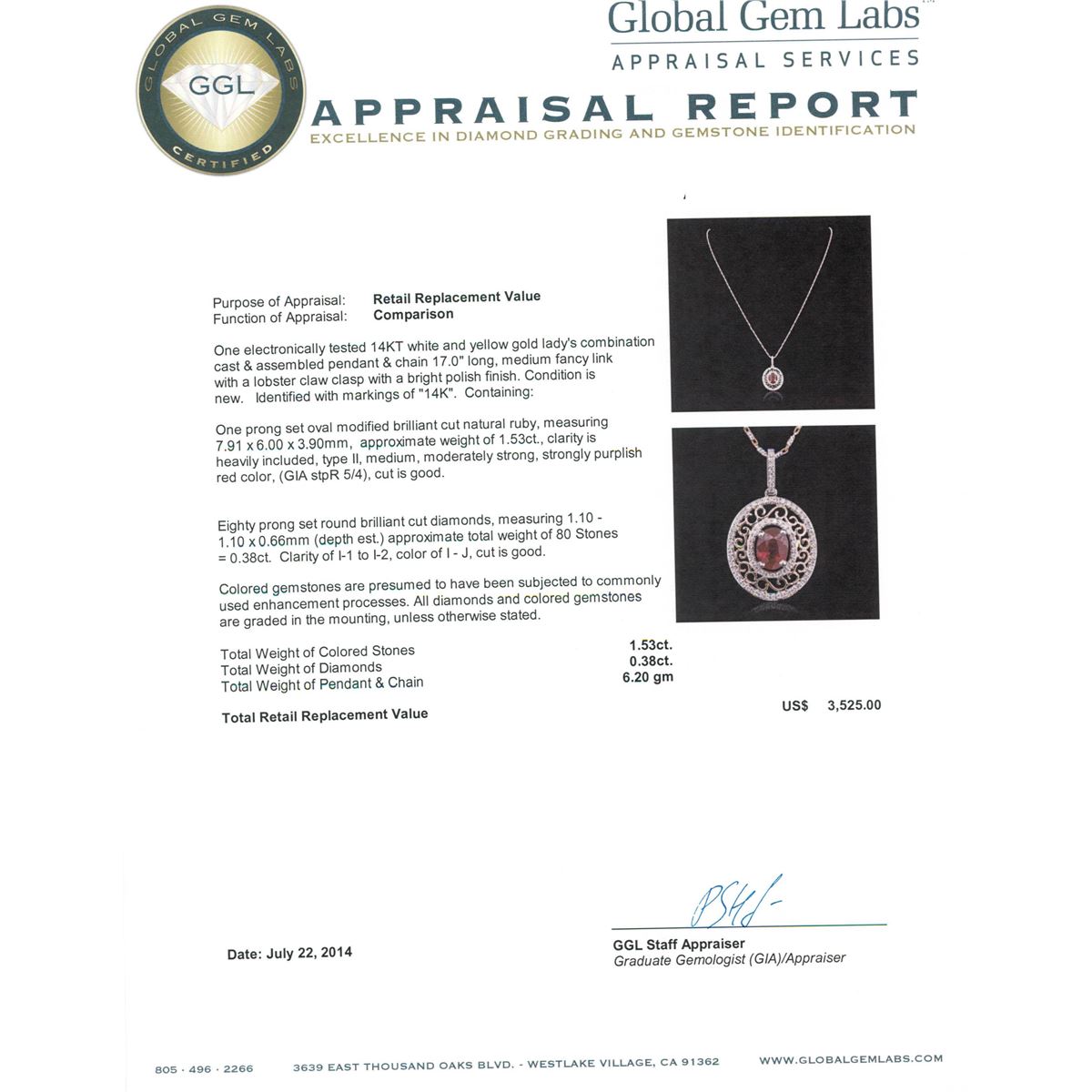 One electronically tested 14KT white and yellow gold ladies combination cast & assembled pendant & chain 17.0" long, medium fancy link with a lobster claw clasp with a bright polish finish. Condition is new. Identified with markings of "14K". Containing: One prong set oval modified brilliant cut natural ruby, measuring 7.91 x 6.00 x 3.90mm, approximate weight of 1.53ct., clarity is heavily included, type II, medium, moderately strong, strongly purplish red color, (GIA stpR 5/4), cut is good. Eighty prong set round brilliant cut diamonds, measuring 1.10 - 1.10 x 0.66mm (depth est.) approximate total weight of 80 Stones = 0.38ct. Clarity: I-1 to I-2. Color: I - J, Cut is Good. Colored gemstones are presumed to have been subjected to commonly used enhancement processes. All diamonds and colored gemstones are graded in the mounting, unless otherwise stated. Total Weight of Colored Stones 1.53ct. Total Weight of Diamonds 0.38ct. Total Weight of Pendant & Chain 6.20 grams. GGL Appraised at $3,525.00.