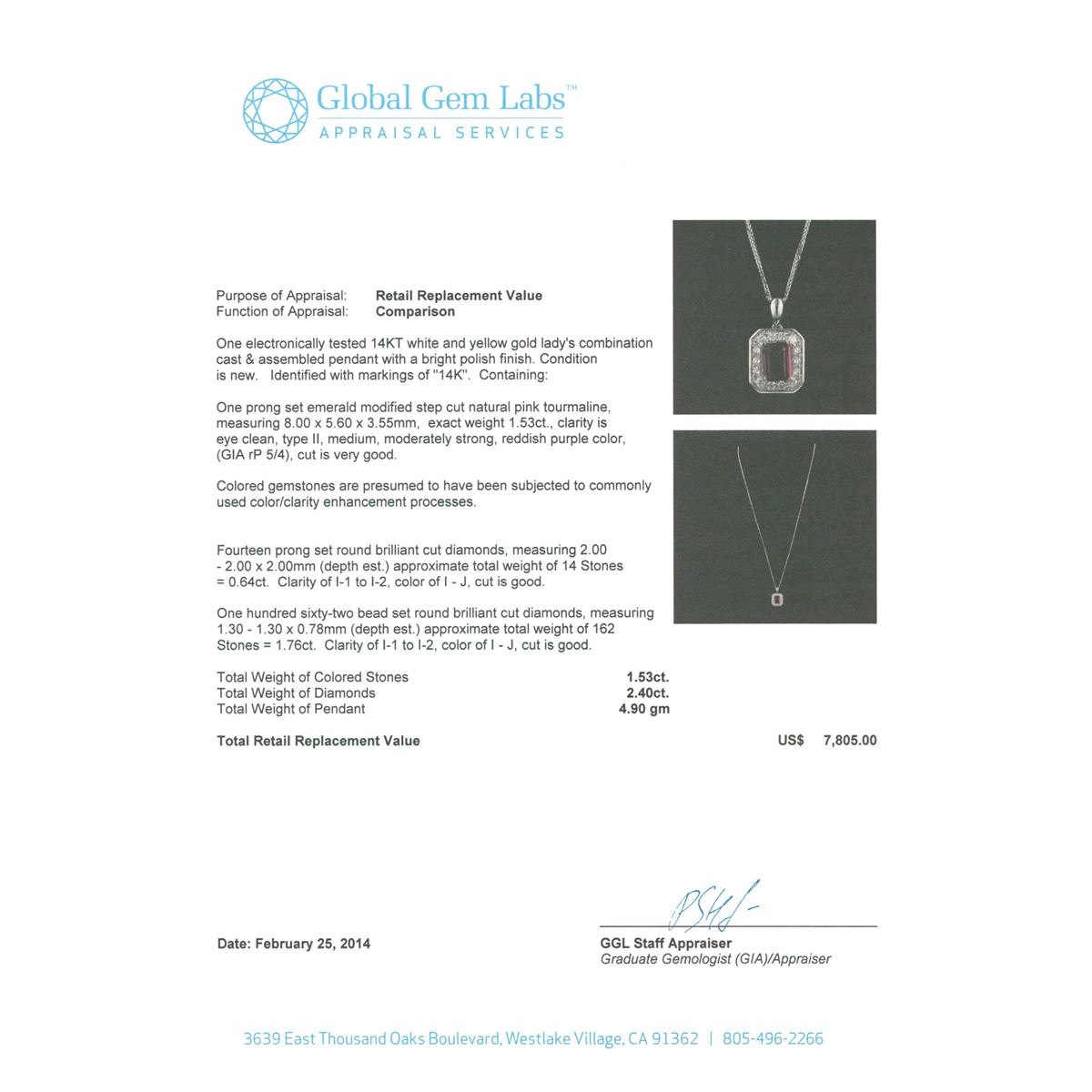 One electronically tested 14KT white and yellow gold Ladies combination cast & assembled pendant with a bright polish finish. Condition is new. Identified with markings of "14K". Containing: One prong set emerald modified step cut natural pink tourmaline, measuring 8.00 x 5.60 x 3.55mm, exact weight 1.53ct., clarity is eye clean, type II, medium, moderately strong, reddish purple color, (GIA rP 5/4), cut is very good. Colored gemstones are presumed to have been subjected to commonly used color/clarity enhancement processes. Fourteen prong set round brilliant cut diamonds, measuring 2.00 - 2.00 x 2.00mm (depth est.) approximate. Total Weight of 14 Stones = 0.64ct. Clarity: I-1 to I-2. Color: I - J, Cut is Good. One Hundred Sixty-Two bead set round brilliant cut diamonds, measuring 1.30 - 1.30 x 0.78mm (depth est.) approximate. Total Weight of 162 Stones = 1.76ct. Clarity: I-1 to I-2. Color: I - J, Cut is Good. Total Weight of Colored Stones 1.53ct. Total Weight of Diamonds 2.40ct. Total Weight of Pendant 4.90 grams. GGL Appraised at $7,805.00.