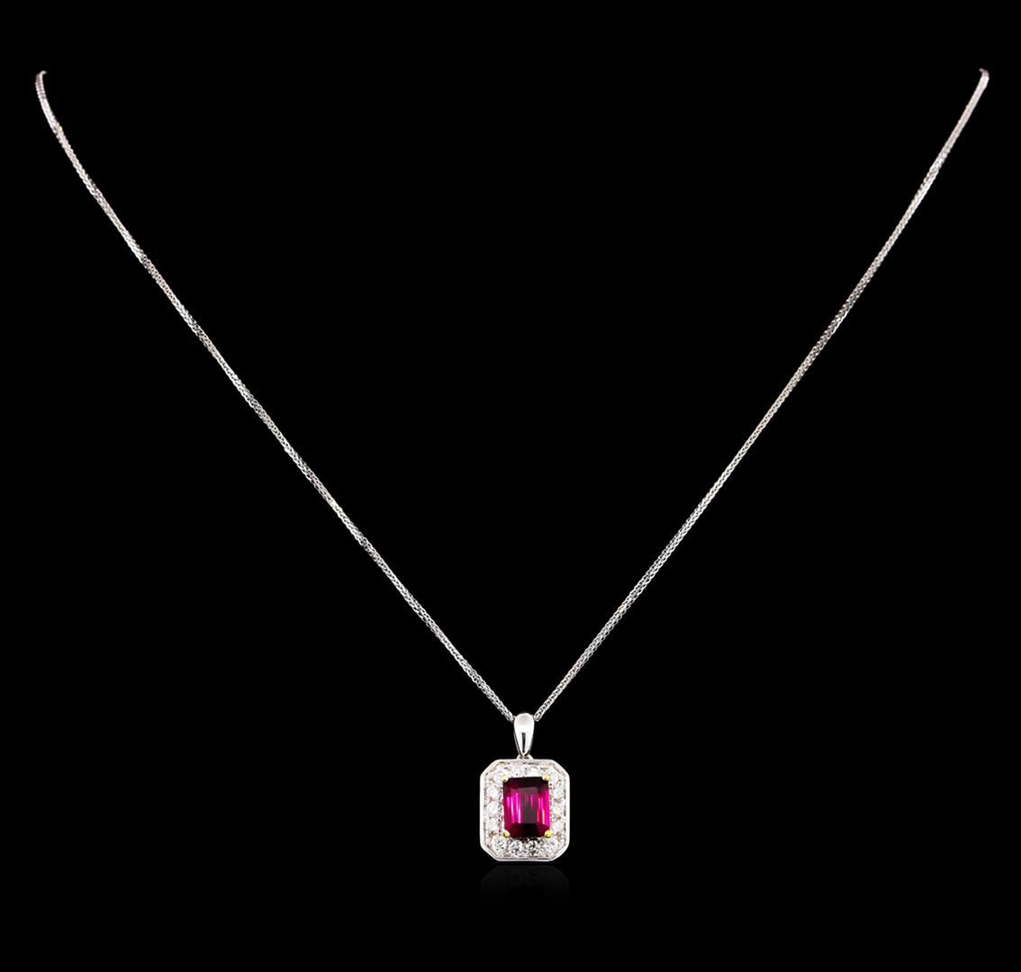 One electronically tested 14KT white and yellow gold Ladies combination cast & assembled pendant with a bright polish finish. Condition is new. Identified with markings of "14K". Containing: One prong set emerald modified step cut natural pink tourmaline, measuring 8.00 x 5.60 x 3.55mm, exact weight 1.53ct., clarity is eye clean, type II, medium, moderately strong, reddish purple color, (GIA rP 5/4), cut is very good. Colored gemstones are presumed to have been subjected to commonly used color/clarity enhancement processes. Fourteen prong set round brilliant cut diamonds, measuring 2.00 - 2.00 x 2.00mm (depth est.) approximate. Total Weight of 14 Stones = 0.64ct. Clarity: I-1 to I-2. Color: I - J, Cut is Good. One Hundred Sixty-Two bead set round brilliant cut diamonds, measuring 1.30 - 1.30 x 0.78mm (depth est.) approximate. Total Weight of 162 Stones = 1.76ct. Clarity: I-1 to I-2. Color: I - J, Cut is Good. Total Weight of Colored Stones 1.53ct. Total Weight of Diamonds 2.40ct. Total Weight of Pendant 4.90 grams. GGL Appraised at $7,805.00.