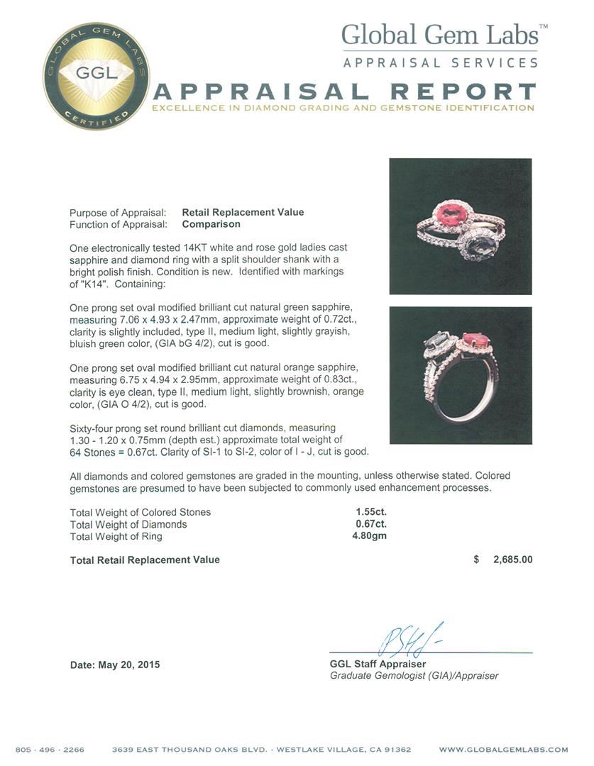 One electronically tested 14KT white and rose gold ladies cast sapphire and diamond ring with a split shoulder shank with a bright polish finish. Identified with markings of "K14". Condition is new. Containing: One prong set oval modified brilliant cut natural green sapphire, measuring 7.06 x 4.93 x 2.47mm, approximate weight of 0.72ct., clarity is slightly included, type II, medium light, slightly grayish, bluish green color, (GIA bG 4/2), cut is good. One prong set oval modified brilliant cut natural orange sapphire, measuring 6.75 x 4.94 x 2.95mm, approximate weight of 0.83ct., clarity is eye clean, type II, medium light, slightly brownish, orange color, (GIA O 4/2), cut is good. Sixty-Four prong set round brilliant cut diamonds, measuring 1.30 - 1.20 x 0.75mm (depth est.) approximate total weight of 64 Stones = 0.67ct. Clarity: SI-1 to SI-2. Color: I - J, Cut is Good. All diamonds and colored gemstones are graded in the mounting, unless otherwise stated. Colored gemstones are presumed to have been subjected to commonly used enhancement processes. Total Weight of Colored Stones 1.55ct. Total Weight of Diamonds 0.67ct. Total Weight of Ring 4.80 grams. GGL Appraised at $2,685.00.