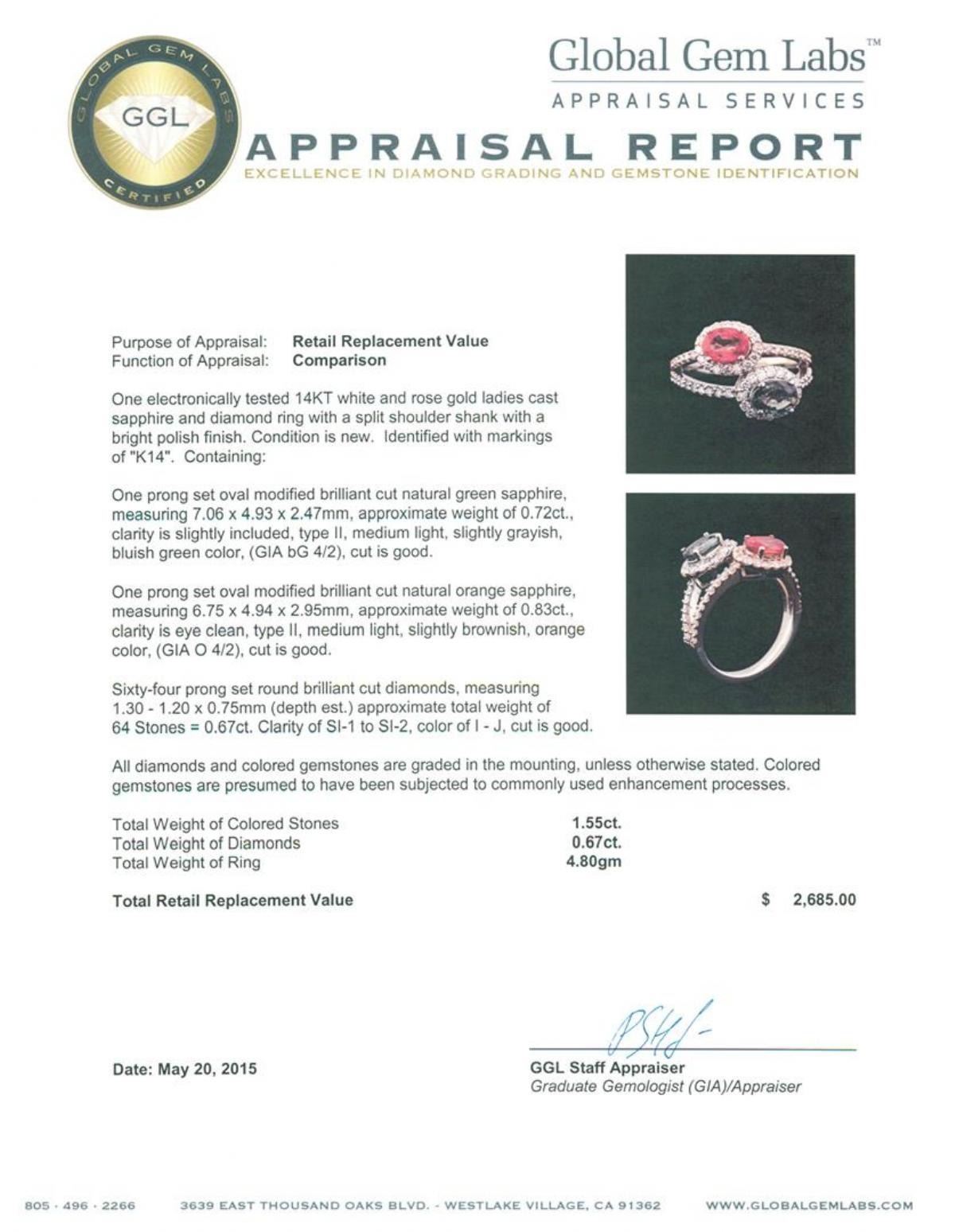 One electronically tested 14KT white and rose gold ladies cast sapphire and diamond ring with a split shoulder shank with a bright polish finish. Identified with markings of "K14". Condition is new. Containing: One prong set oval modified brilliant cut natural green sapphire, measuring 7.06 x 4.93 x 2.47mm, approximate weight of 0.72ct., clarity is slightly included, type II, medium light, slightly grayish, bluish green color, (GIA bG 4/2), cut is good. One prong set oval modified brilliant cut natural orange sapphire, measuring 6.75 x 4.94 x 2.95mm, approximate weight of 0.83ct., clarity is eye clean, type II, medium light, slightly brownish, orange color, (GIA O 4/2), cut is good. Sixty-Four prong set round brilliant cut diamonds, measuring 1.30 - 1.20 x 0.75mm (depth est.) approximate total weight of 64 Stones = 0.67ct. Clarity: SI-1 to SI-2. Color: I - J, Cut is Good. All diamonds and colored gemstones are graded in the mounting, unless otherwise stated. Colored gemstones are presumed to have been subjected to commonly used enhancement processes. Total Weight of Colored Stones 1.55ct. Total Weight of Diamonds 0.67ct. Total Weight of Ring 4.80 grams. GGL Appraised.