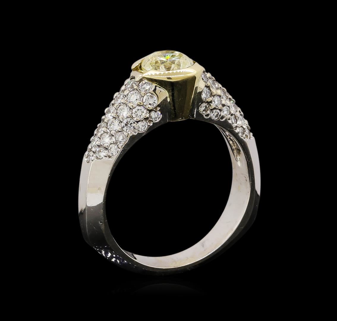 One electronically tested 14KT white and yellow gold ladies cast diamond engagement ring with a bright polish finish. Identified with markings of "14K". Condition is new. Containing: One bezel set round brilliant cut diamond, measuring 6.00 - 6.00 x 3.60mm (depth est.) approximate weight of 0.79ct. Clarity: I-2, Cut is Good. Forty-Four prong set round brilliant cut diamonds, measuring 1.70 - 1.70 x 1.02mm (depth est.) approximate total weight of 44 Stones = 0.79ct. Clarity: SI-1. Color: I - J, Cut is Good. All diamonds are graded in the mounting, unless otherwise stated. Total Weight of Diamonds 1.58ct. Total Weight of Engagement Ring 6.80 grams. GGL Appraised at $4,855.00.