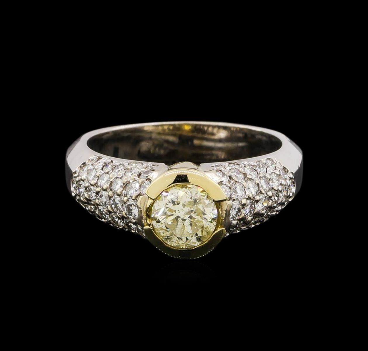 One electronically tested 14KT white and yellow gold ladies cast diamond engagement ring with a bright polish finish. Identified with markings of "14K". Condition is new. Containing: One bezel set round brilliant cut diamond, measuring 6.00 - 6.00 x 3.60mm (depth est.) approximate weight of 0.79ct. Clarity: I-2, Cut is Good. Forty-Four prong set round brilliant cut diamonds, measuring 1.70 - 1.70 x 1.02mm (depth est.) approximate total weight of 44 Stones = 0.79ct. Clarity: SI-1. Color: I - J, Cut is Good. All diamonds are graded in the mounting, unless otherwise stated. Total Weight of Diamonds 1.58ct. Total Weight of Engagement Ring 6.80 grams. GGL Appraised.