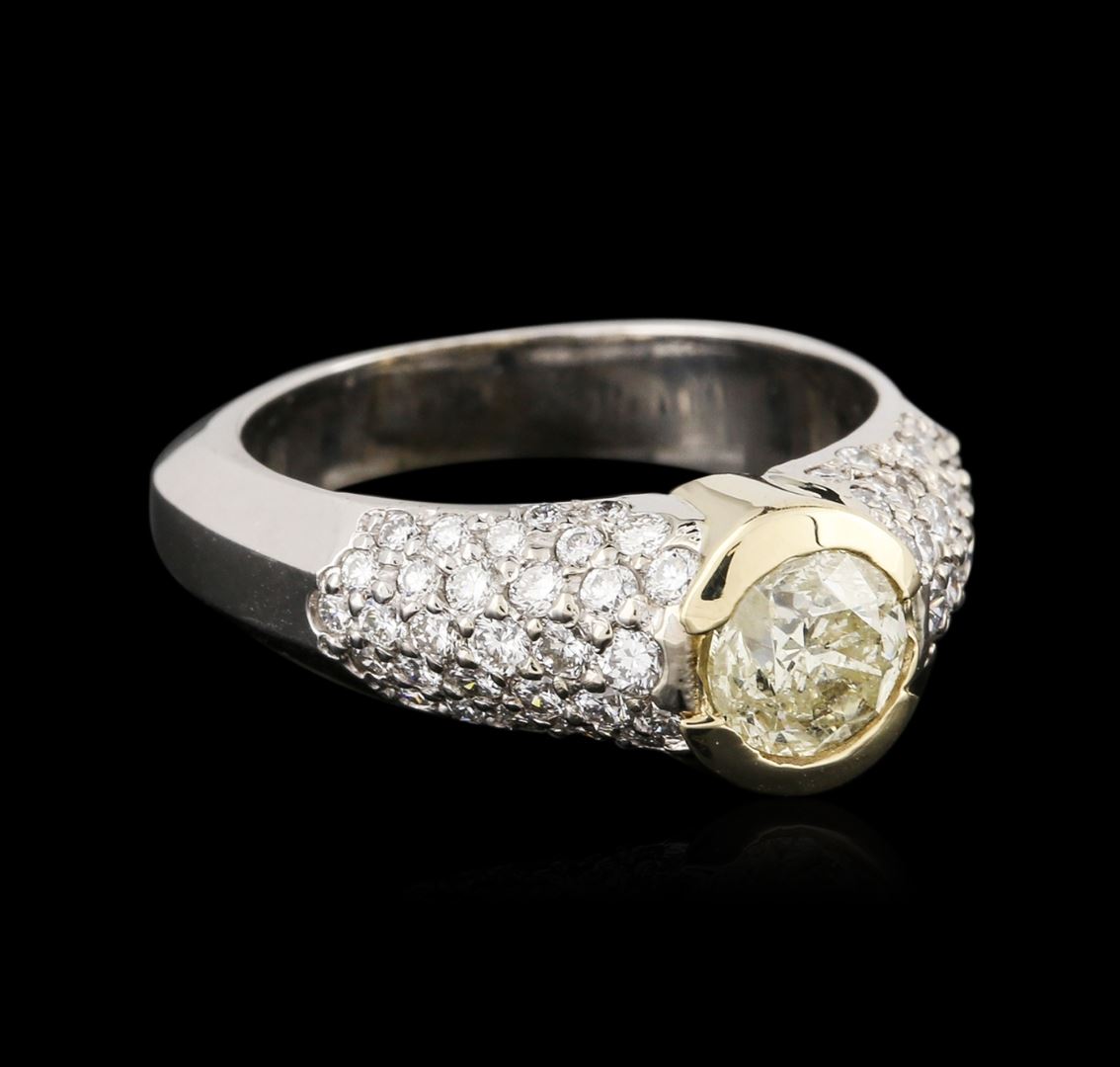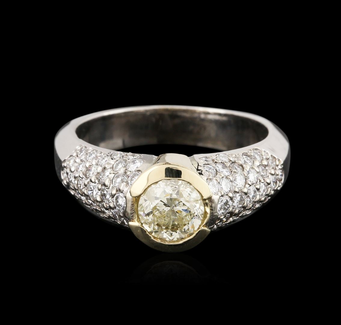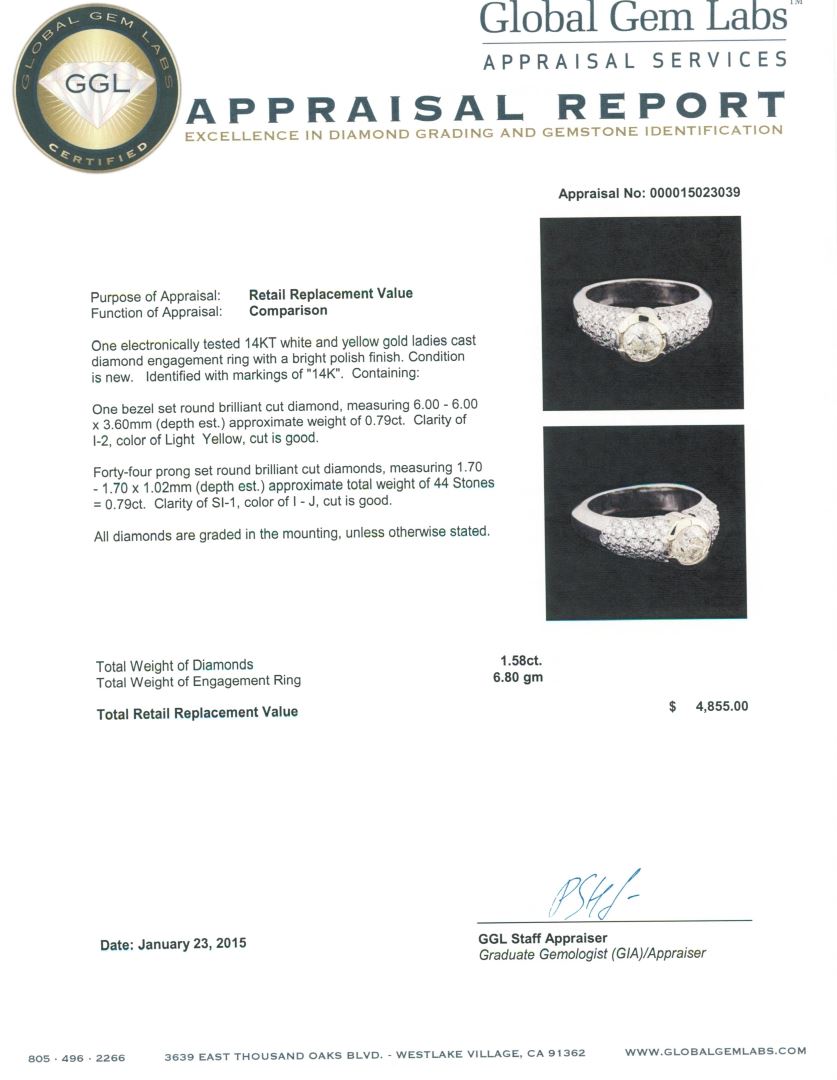 One electronically tested 14KT white and yellow gold ladies cast diamond engagement ring with a bright polish finish. Identified with markings of "14K". Condition is new. Containing: One bezel set round brilliant cut diamond, measuring 6.00 - 6.00 x 3.60mm (depth est.) approximate weight of 0.79ct. Clarity: I-2, Cut is Good. Forty-Four prong set round brilliant cut diamonds, measuring 1.70 - 1.70 x 1.02mm (depth est.) approximate total weight of 44 Stones = 0.79ct. Clarity: SI-1. Color: I - J, Cut is Good. All diamonds are graded in the mounting, unless otherwise stated. Total Weight of Diamonds 1.58ct. Total Weight of Engagement Ring 6.80 grams. GGL Appraised at $4,855.00.