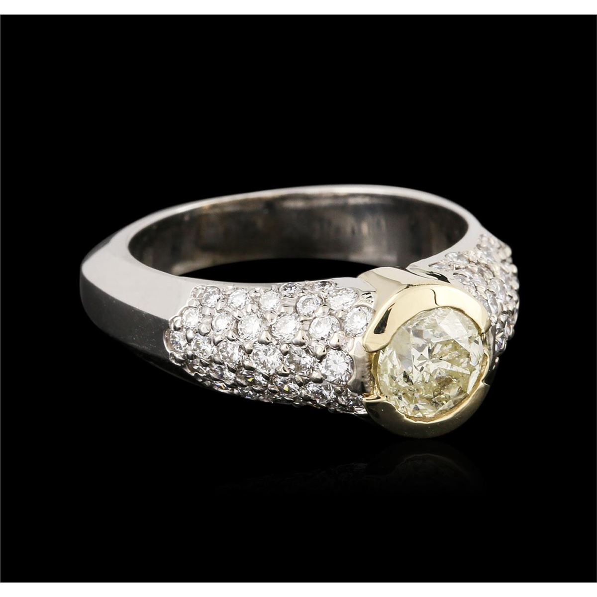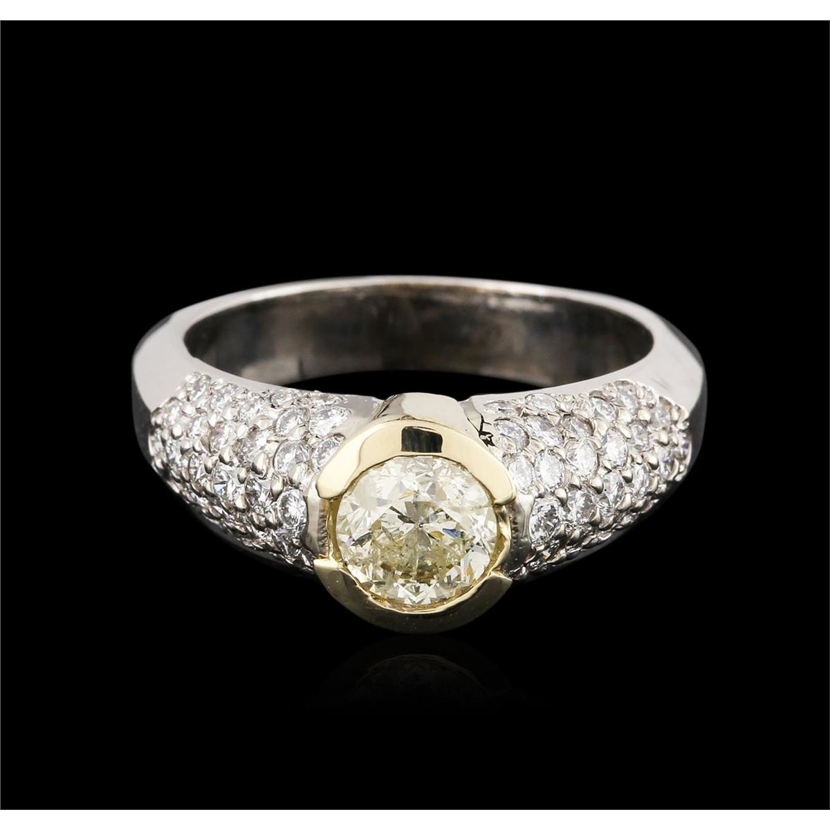 One electronically tested 14KT white and yellow gold ladies cast diamond engagement ring with a bright polish finish. Identified with markings of "14K". Condition is new. Containing: One bezel set round brilliant cut diamond, measuring 6.00 - 6.00 x 3.60mm (depth est.) approximate weight of 0.79ct. Clarity: I-2, Cut is Good. Forty-Four prong set round brilliant cut diamonds, measuring 1.70 - 1.70 x 1.02mm (depth est.) approximate total weight of 44 Stones = 0.79ct. Clarity: SI-1. Color: I - J, Cut is Good. All diamonds are graded in the mounting, unless otherwise stated. Total Weight of Diamonds 1.58ct. Total Weight of Engagement Ring 6.80 grams. GGL Appraised at $4,855.00.