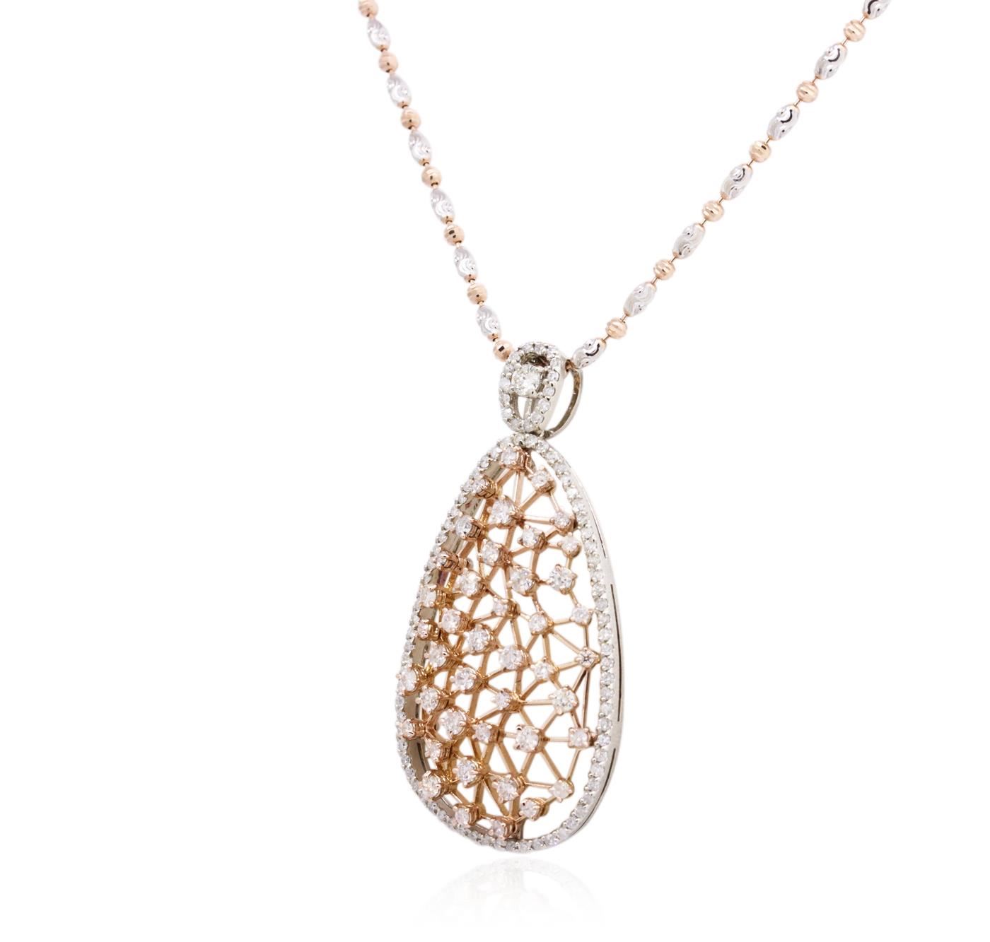 One electronically tested 14KT white and rose gold ladies combination cast & assembled diamond pendant & chain 18.0" long, cable link with a lobster claw clasp with a bright polish finish. Identified with markings of "585". Condition is new. Containing: Forty-Two prong set round brilliant cut diamonds, measuring 2.00 - 2.00 x 1.20mm (depth est.) approximate total weight of 42 Stones = 1.23ct. Clarity: I-1 to I-2. Color: I, Cut is Good. Sixty prong set round brilliant cut diamonds, measuring 1.10 - 1.10 x 0.66mm (depth est.) approximate total weight of 60 Stones = 0.29ct. Clarity: SI-2 to I-2. Color: I, Cut is Good. One prong set round brilliant cut diamond, measuring 3.00 - 3.00 x 1.80mm (depth est.) approximate weight of 0.10ct. Clarity: I-1. Color: J, Cut is Good. All diamonds are graded in the mounting, unless otherwise stated. Total Weight of Diamonds 1.61ct. Total Weight of Pendant & Chain 13.70 grams. GGL Appraised at $7,730.00.