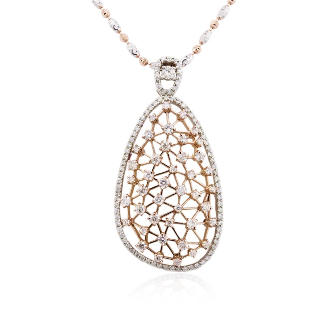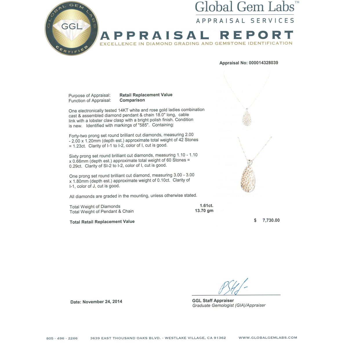 One electronically tested 14KT white and rose gold ladies combination cast & assembled diamond pendant & chain 18.0" long, cable link with a lobster claw clasp with a bright polish finish. Identified with markings of "585". Condition is new. Containing: Forty-Two prong set round brilliant cut diamonds, measuring 2.00 - 2.00 x 1.20mm (depth est.) approximate total weight of 42 Stones = 1.23ct. Clarity: I-1 to I-2. Color: I, Cut is Good. Sixty prong set round brilliant cut diamonds, measuring 1.10 - 1.10 x 0.66mm (depth est.) approximate total weight of 60 Stones = 0.29ct. Clarity: SI-2 to I-2. Color: I, Cut is Good. One prong set round brilliant cut diamond, measuring 3.00 - 3.00 x 1.80mm (depth est.) approximate weight of 0.10ct. Clarity: I-1. Color: J, Cut is Good. All diamonds are graded in the mounting, unless otherwise stated. Total Weight of Diamonds 1.61ct. Total Weight of Pendant & Chain 13.70 grams. GGL Appraised at $7,730.00.