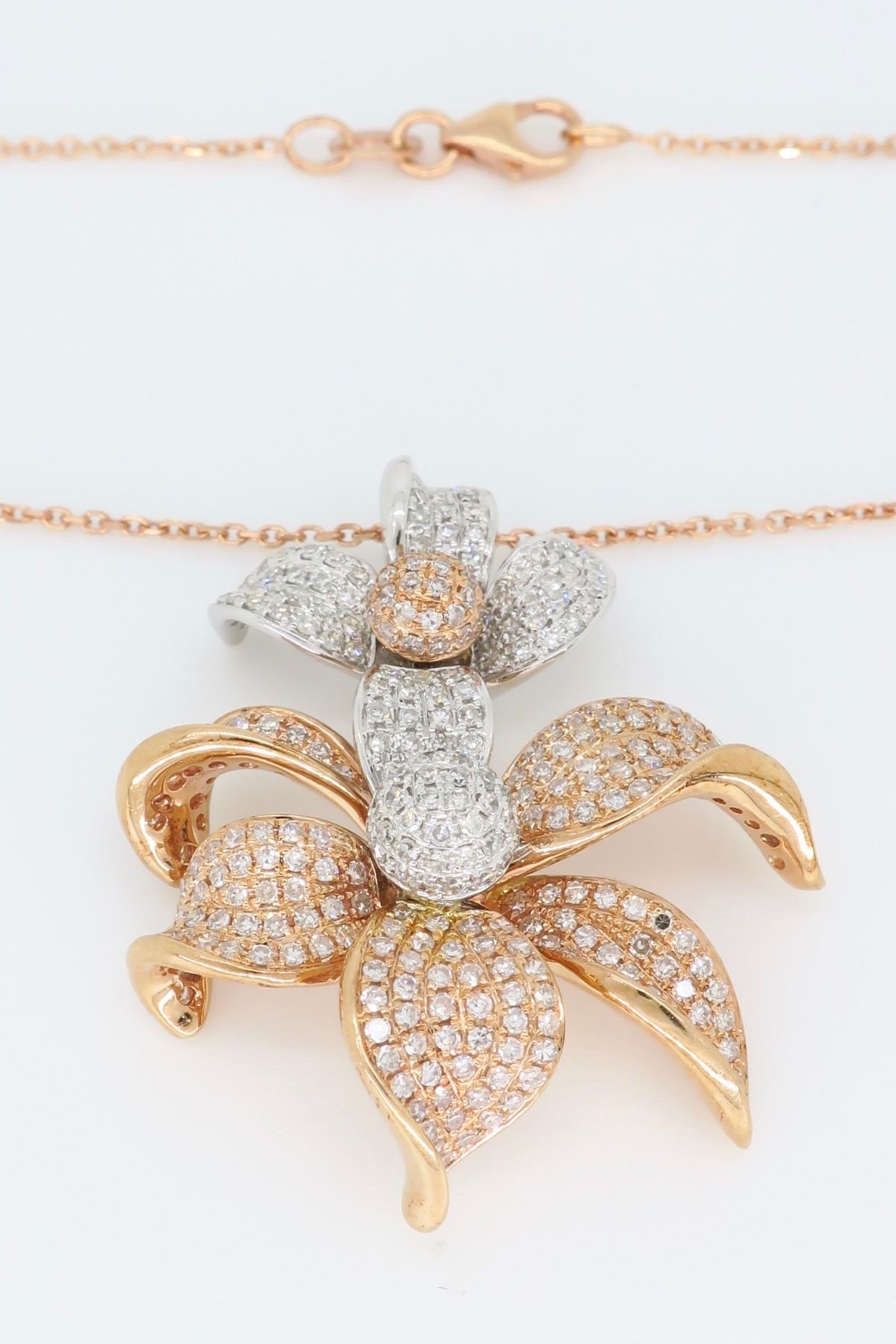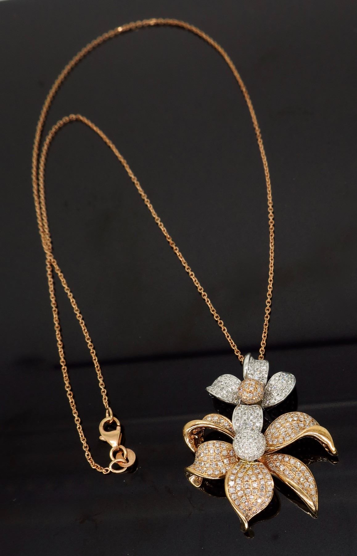 One 14KT Two Tone Gold 1.61ctw Diamond Pendant with Chain. Single cut Diamonds with a total weight of 1.61cts with a color of G-I and clarity of VS-2 to SI-1. Total weight of pendant is 8.9 grams. Total length of chain is 18 inches.