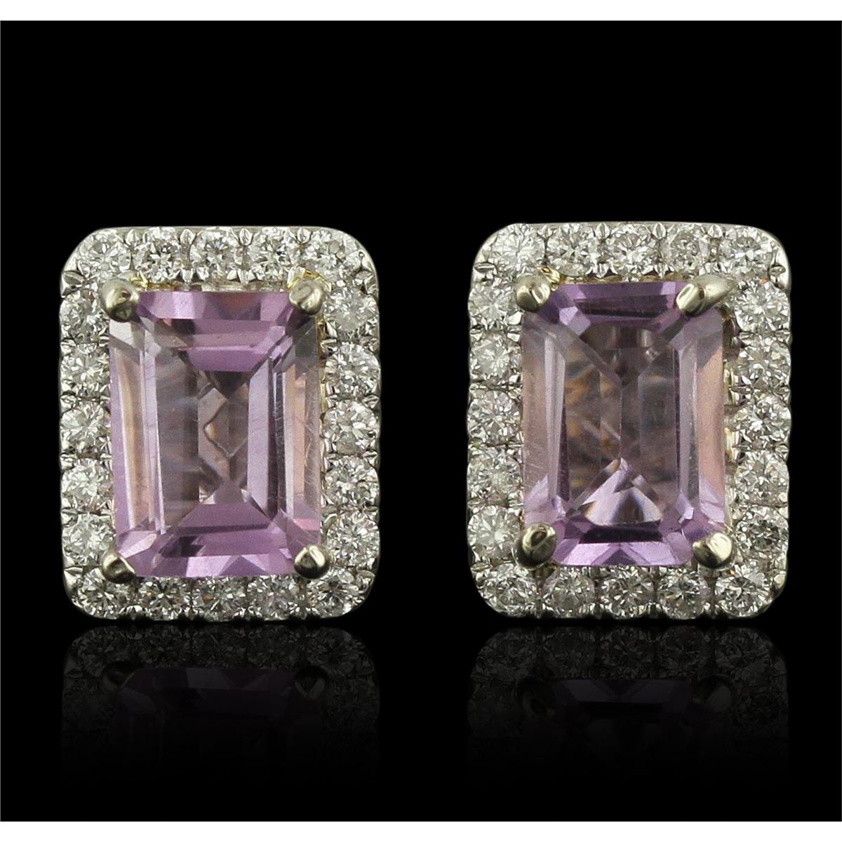 One pair electronically tested 14KT white and yellow gold Ladies combination cast & assembled stud earrings with friction posts with a bright polish finish. Condition is new. Identified with markings of "14K". Containing: Thirty-Eight prong set round brilliant cut diamonds, measuring 1.30 - 1.30 x 0.78mm (depth est.) approximate. Total Weight of 38 Stones = 0.45ct. Clarity: I-1 to I-2. Color: H - I, Cut is Good. Two prong set emerald standard step cut natural amethysts, measuring 7.00 x 5.00 x 3.25mm, approximate. Total Weight of 1.68ct., clarity is eye clean, type II, light, very slightly grayish, purple color, (GIA P 3/3), cut is good. Colored gemstones are presumed to have been subjected to commonly used color/clarity enhancement processes. Total Weight of Colored Stones 1.68ct. Total Weight of Diamonds 0.45ct. Total Weight of Earrings 3.40 grams. GGL Appraised at $2,355.00.