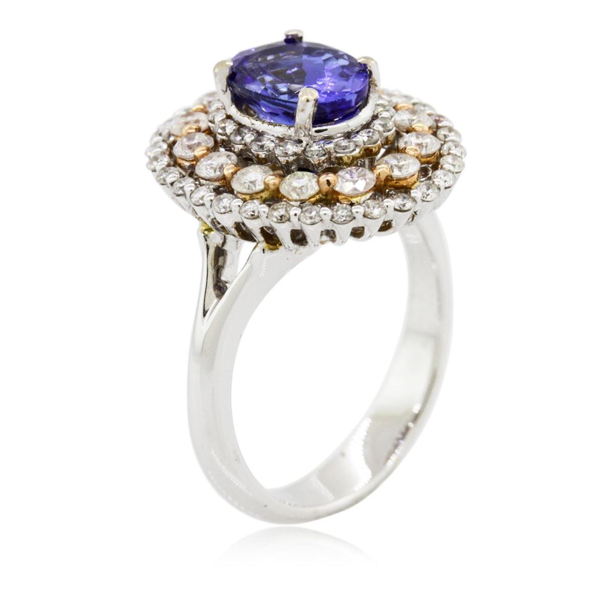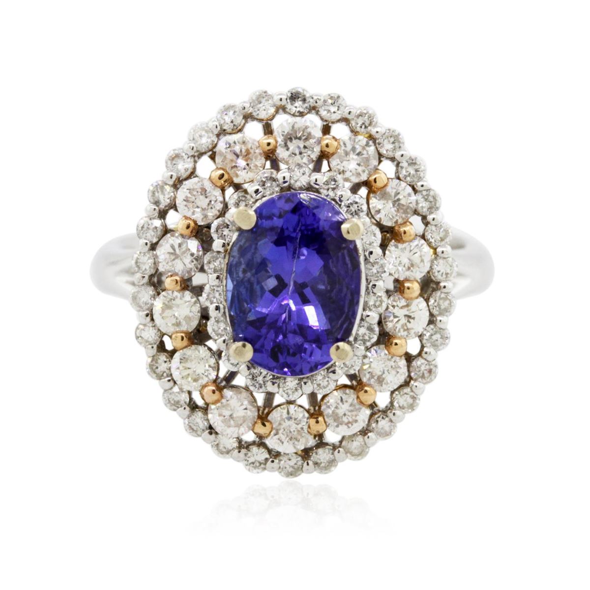 One electronically tested 14KT white and yellow gold Ladies combination cast & assembled ring with a bright polish finish. Condition is new. Identified with markings of "14K". Containing: One prong set oval modified brilliant cut natural tanzanite, measuring 8.60 x 6.40 x 4.60mm, approximate weight of 1.73ct., clarity is eye clean, type I, medium light, very slightly grayish, bluish violet color, (GIA bV 4/3), cut is good. Colored gemstones are presumed to have been subjected to commonly used color/clarity enhancement processes. Fourteen prong set round brilliant cut diamonds, measuring 2.20 - 2.20 x 1.32mm (depth est.) approximate. Total Weight of 14 Stones = 0.55ct. . Clarity: I-1. Color: I - J, Cut is Good. Forty-Eight prong set round brilliant cut diamonds, measuring 1.30 - 1.30 x 0.78mm (depth est.) approximate. Total Weight of 48 Stones = 0.38ct. . Clarity: I-1 to I-2. Color: I - J, Cut is Good. . Total Weight of Colored Stones 1.73ct. Total Weight of Diamonds 0.93ct. Total Weight of Ring 7.70 grams. GGL Appraised at $7,040.00.