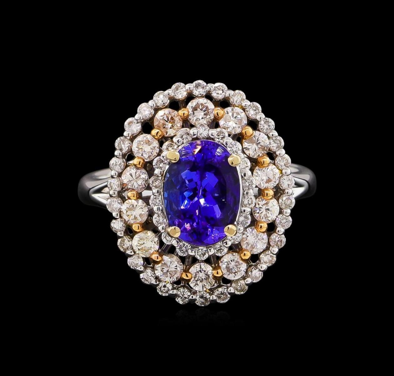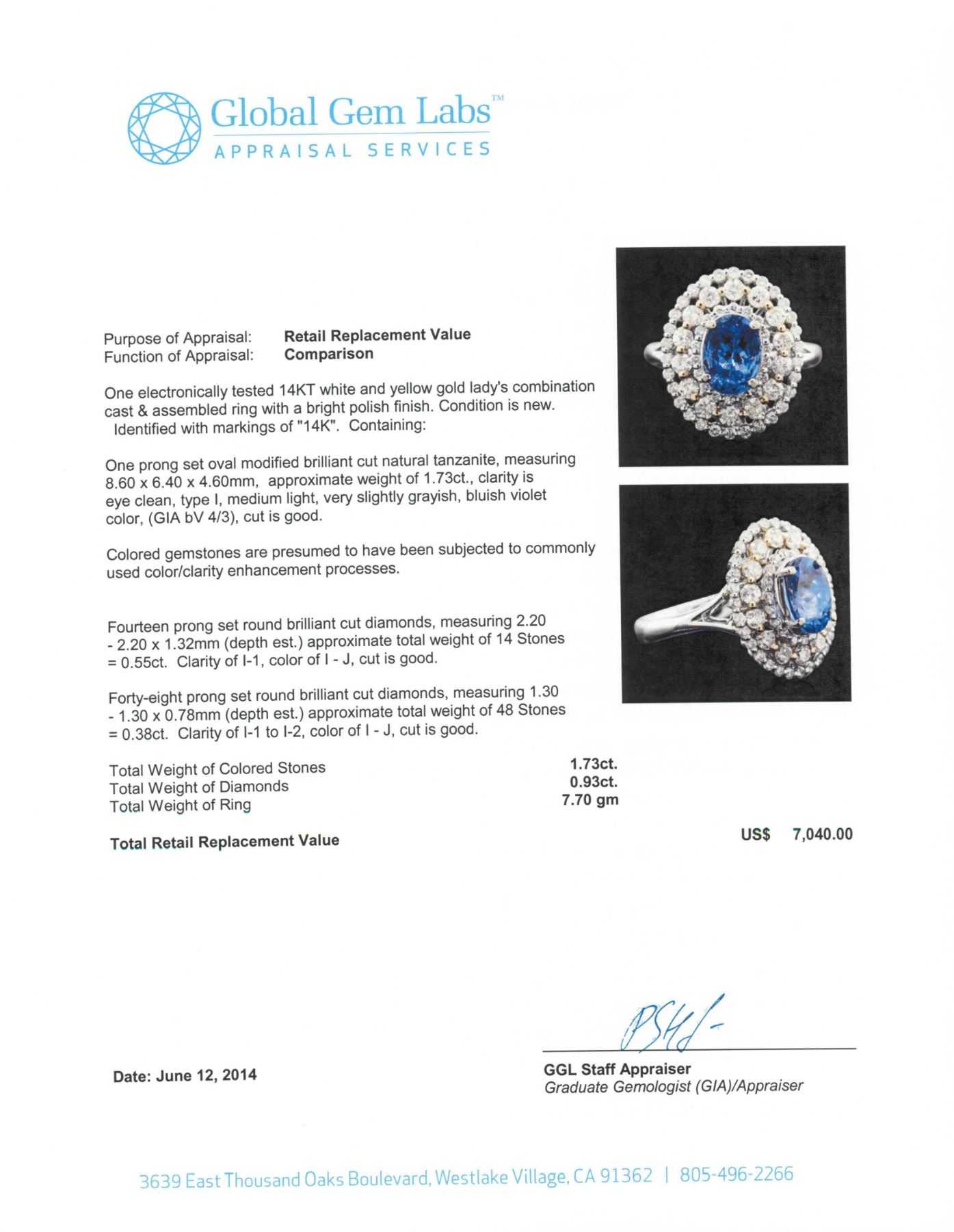 One electronically tested 14KT white and yellow gold Ladies combination cast & assembled ring with a bright polish finish. Condition is new. Identified with markings of "14K". Containing: One prong set oval modified brilliant cut natural tanzanite, measuring 8.60 x 6.40 x 4.60mm, approximate weight of 1.73ct., clarity is eye clean, type I, medium light, very slightly grayish, bluish violet color, (GIA bV 4/3), cut is good. Colored gemstones are presumed to have been subjected to commonly used color/clarity enhancement processes. Fourteen prong set round brilliant cut diamonds, measuring 2.20 - 2.20 x 1.32mm (depth est.) approximate. Total Weight of 14 Stones = 0.55ct. . Clarity: I-1. Color: I - J, Cut is Good. Forty-Eight prong set round brilliant cut diamonds, measuring 1.30 - 1.30 x 0.78mm (depth est.) approximate. Total Weight of 48 Stones = 0.38ct. . Clarity: I-1 to I-2. Color: I - J, Cut is Good. . Total Weight of Colored Stones 1.73ct. Total Weight of Diamonds 0.93ct. Total Weight of Ring 7.70 grams. GGL Appraised.
