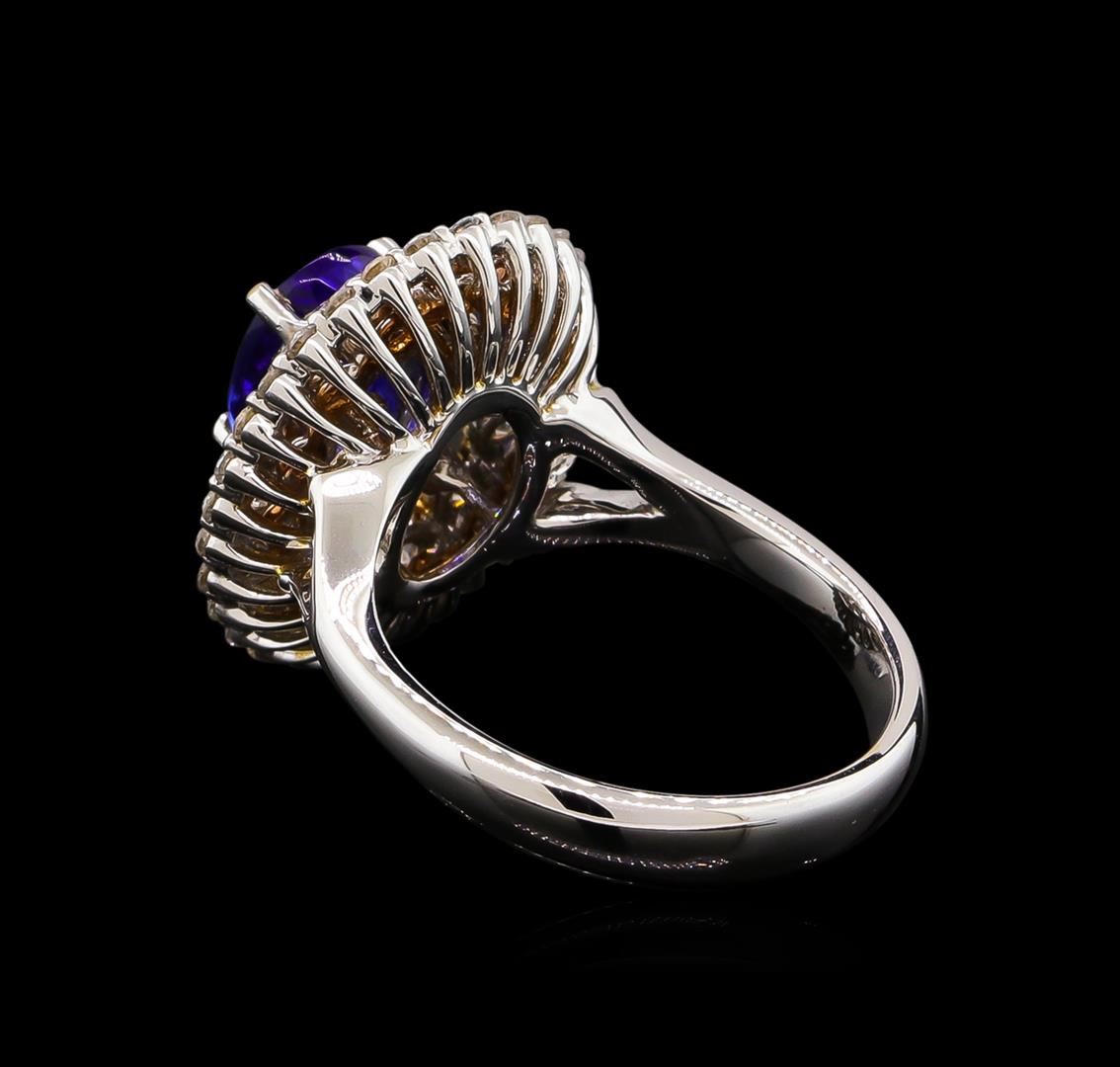 One electronically tested 14KT white and yellow gold Ladies combination cast & assembled ring with a bright polish finish. Condition is new. Identified with markings of "14K". Containing: One prong set oval modified brilliant cut natural tanzanite, measuring 8.60 x 6.40 x 4.60mm, approximate weight of 1.73ct., clarity is eye clean, type I, medium light, very slightly grayish, bluish violet color, (GIA bV 4/3), cut is good. Colored gemstones are presumed to have been subjected to commonly used color/clarity enhancement processes. Fourteen prong set round brilliant cut diamonds, measuring 2.20 - 2.20 x 1.32mm (depth est.) approximate. Total Weight of 14 Stones = 0.55ct. . Clarity: I-1. Color: I - J, Cut is Good. Forty-Eight prong set round brilliant cut diamonds, measuring 1.30 - 1.30 x 0.78mm (depth est.) approximate. Total Weight of 48 Stones = 0.38ct. . Clarity: I-1 to I-2. Color: I - J, Cut is Good. . Total Weight of Colored Stones 1.73ct. Total Weight of Diamonds 0.93ct. Total Weight of Ring 7.70 grams. GGL Appraised.