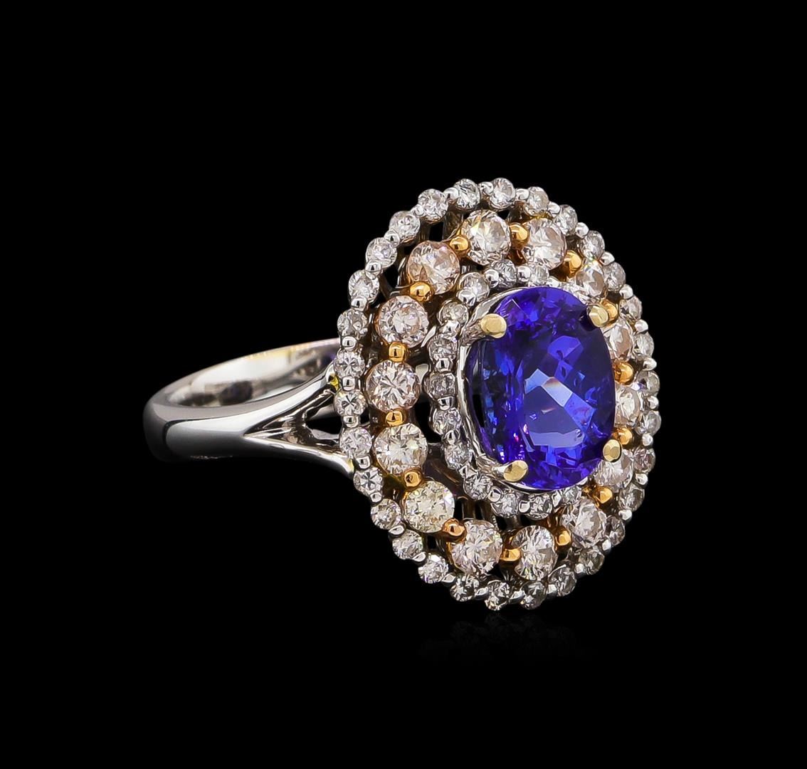 One electronically tested 14KT white and yellow gold Ladies combination cast & assembled ring with a bright polish finish. Condition is new. Identified with markings of "14K". Containing: One prong set oval modified brilliant cut natural tanzanite, measuring 8.60 x 6.40 x 4.60mm, approximate weight of 1.73ct., clarity is eye clean, type I, medium light, very slightly grayish, bluish violet color, (GIA bV 4/3), cut is good. Colored gemstones are presumed to have been subjected to commonly used color/clarity enhancement processes. Fourteen prong set round brilliant cut diamonds, measuring 2.20 - 2.20 x 1.32mm (depth est.) approximate. Total Weight of 14 Stones = 0.55ct.. Clarity: I-1. Color: I - J, Cut is Good. Forty-Eight prong set round brilliant cut diamonds, measuring 1.30 - 1.30 x 0.78mm (depth est.) approximate. Total Weight of 48 Stones = 0.38ct.. Clarity: I-1 to I-2. Color: I - J, Cut is Good.. Total Weight of Colored Stones 1.73ct. Total Weight of Diamonds 0.93ct. Total Weight of Ring 7.70 grams. GGL Appraised.